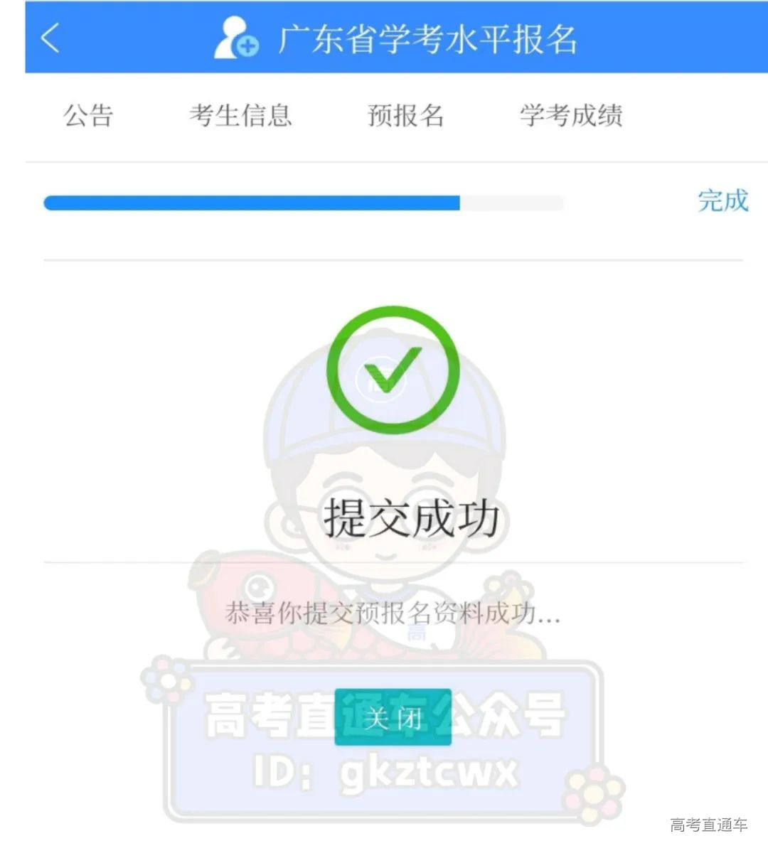 步骤三:按实际情况填写信息并勾选报考科目。核对信息无误,点击【提交】后,再点击【关闭】即可跳转预报名信息表。