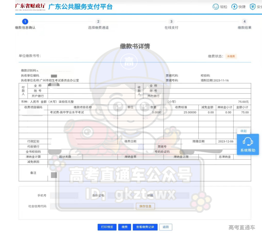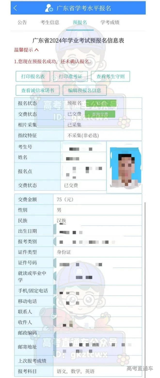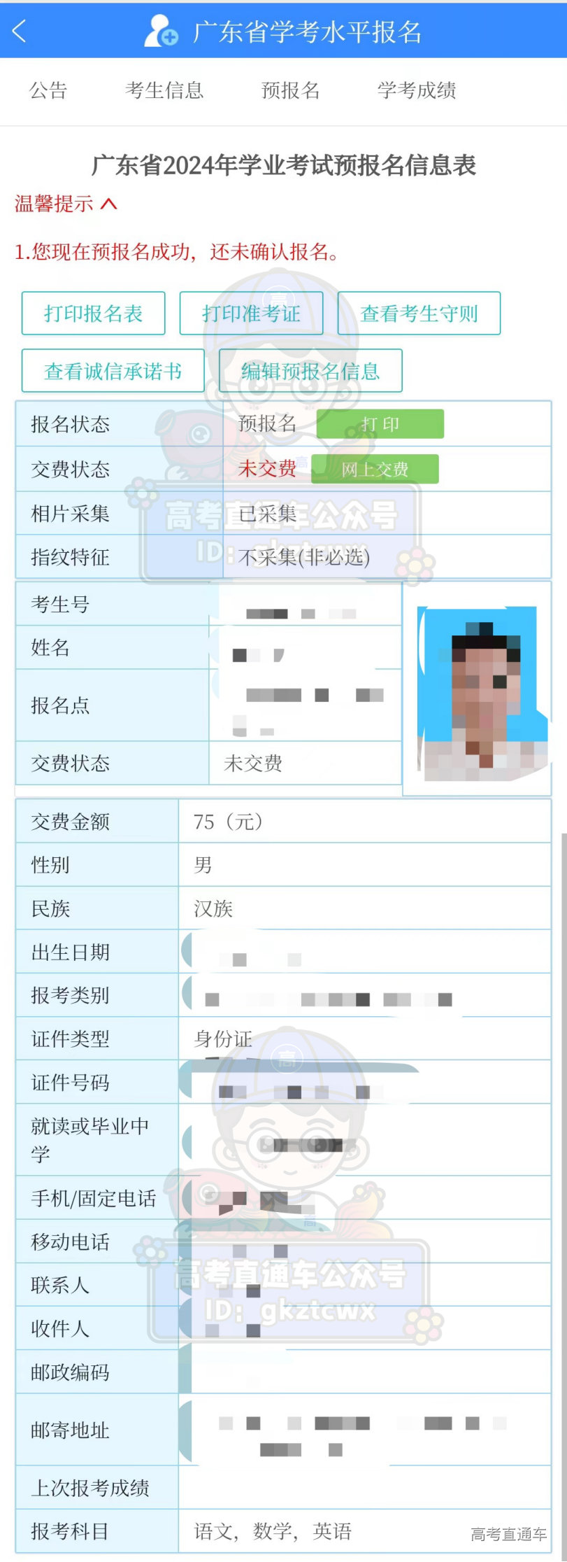 完成交费后,预报名信息表显示如下,即代表预报名成功。