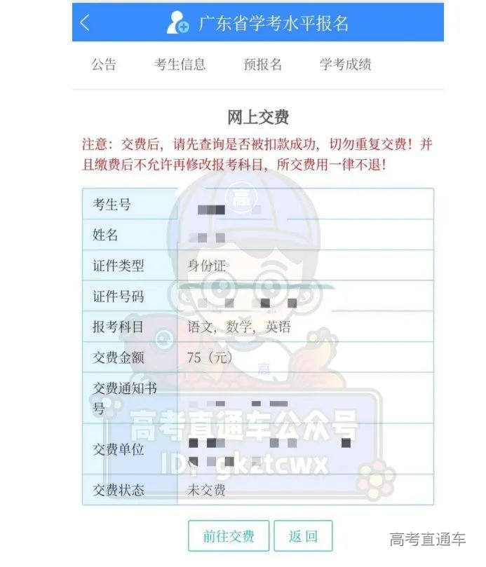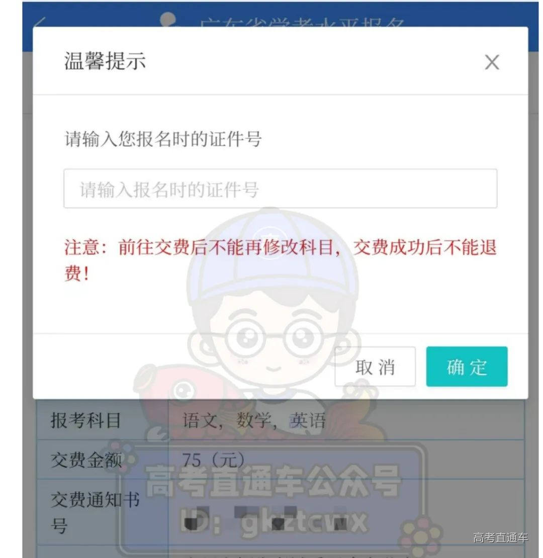注意了!前往交费后不能再修改科目,交费成功后不能退费!同学们务必核对清楚报名科目和费用后再输入证件号👇