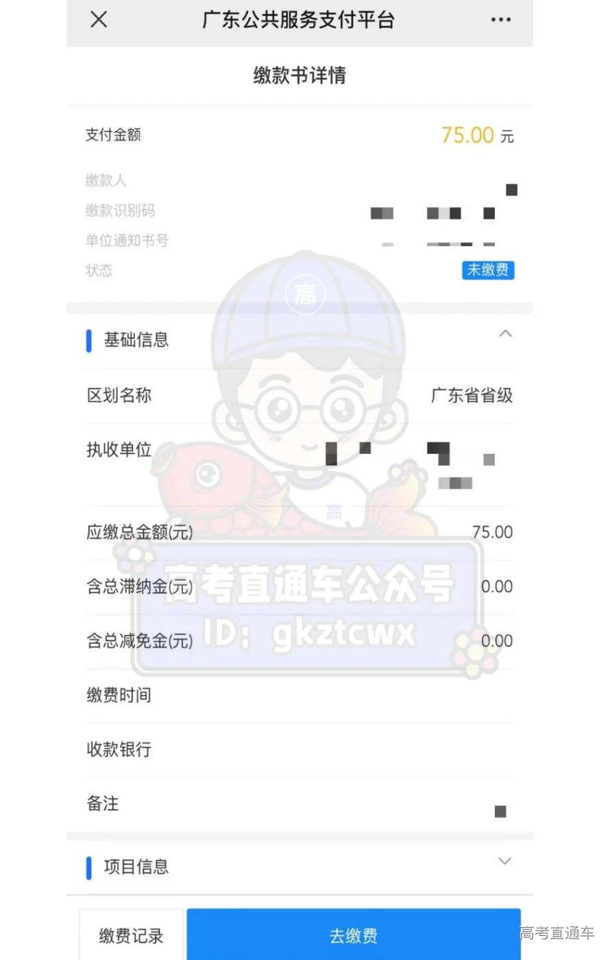 步骤四:报名信息表显示【未交费】,点击【网上交费】,只报名语数英三科的仅需交费75元。