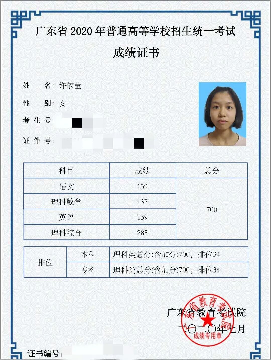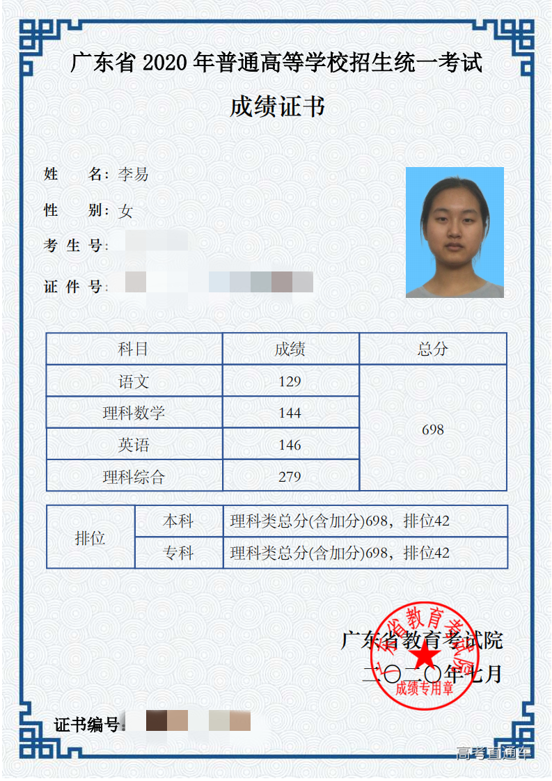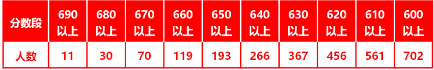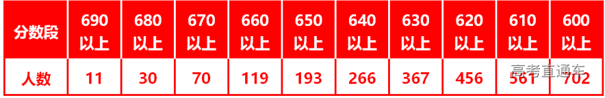 一、尖子生 (1)4人进入全省理科总分前50名,1人进入全省文科总分前20名,成绩被屏蔽人数全省第二。 文科屏蔽生 李彦全665分全省第1名 理科屏蔽生 王畅越713分全省第4名 林欣涛701分全省第29名 许依莹700分全省第34名 李 易698分全省第42名 (2)9人进入全省理科总分前100名,2人进入全省文科总分前50名,共11人,列全省第一。 理科9人 王畅越713分(省第4名) 林欣涛701分(省第29名) 许依莹700分(省第34名) 李 易698分(省第42名) 余任杰697分(省第51名) 闫天行696分(省第62名) 汪逸阳693分(省第82名) 郑元骢693分(省第92名) 陈灏丹692分(省第100名) 文科2人 李彦全665分(省第1名) 吕 灵646分(省第26名) (3)119人理科总分660分以上,768人文理科总分600分以上。 理科各分数段及人数 文科各分数段及人数 (4)12人进入全省文理科总分前100名,24人进入全省文理科总分前200名,47人进入全省文理科总分前500名,102人进入全省文理科总分前1000名,189人进入全省文理科总分前2000名。 (5)单科最高分:语文142分、理科数学144分、文科数学144分、英语148分、理科综合292分、文科综合247分。 二、高分优先投档线人数 2108人上高分优先投档线,全省第一。全费生优投率86.52%,公费生优投率97.95%。 三、有望22人以上考上清华大学、北京大学! 感谢各级党政领导和教育主管部门的正确领导和亲切关怀! 感谢社会各界、广大家长的关心和支持! 感谢母校全体教职员工的辛勤付出! 汕头市潮阳实验学校校友会 2020年8月2日
