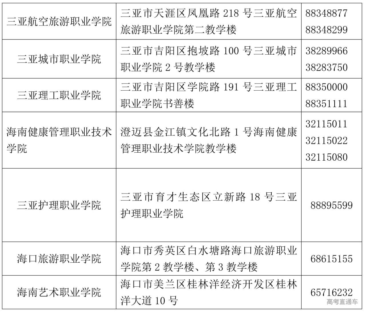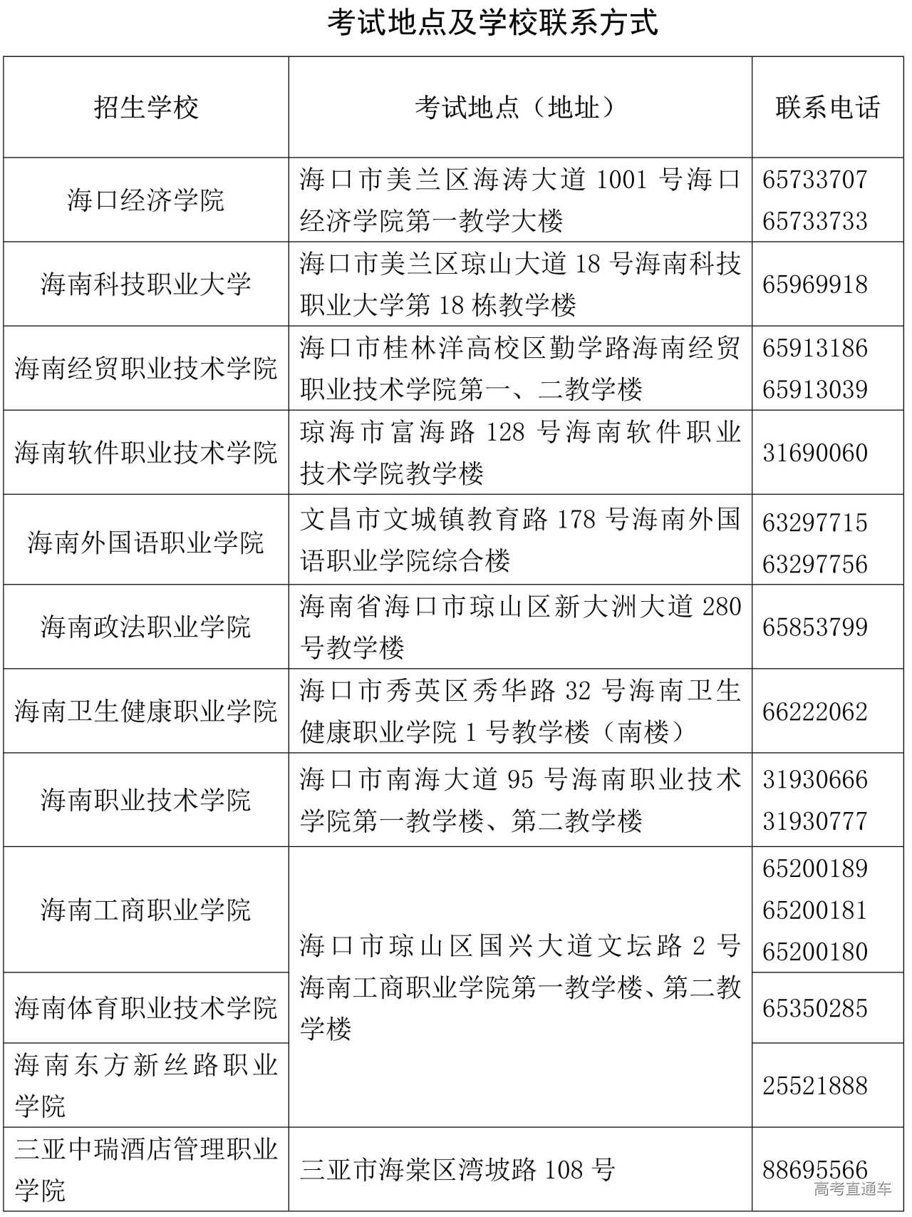 海口经济学院、海南科技职业大学、海南经贸职业技术学院、海南软件职业技术学院、海南外国语职业学院、海南政法职业学院、海南卫生健康职业学院、海南职业技术学院、海南工商职业学院、三亚中瑞酒店管理职业学院、三亚航空旅游职业学院、三亚城市职业学院、三亚理工职业学院、海南健康管理职业技术学院、三亚护理职业学院、海口旅游职业学院、海南艺术职业学院等17所学校,具体考试地点详见准考证。