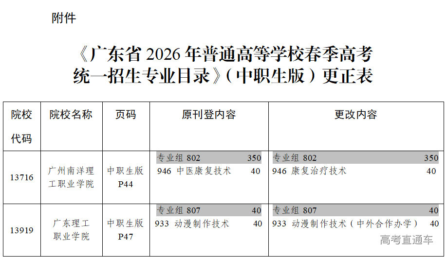 应有关高校要求,现对《广东省2026年普通高校春季高考统一招生专业目录》(中职生版)“3+证书”中职生专科批次部分内容作如下更正(见附件)。