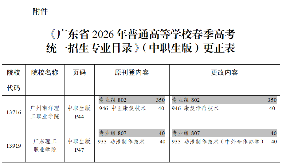 附件:《广东省2026年普通高等学校春季高考统一招生专业目录》(中职生版)更正表