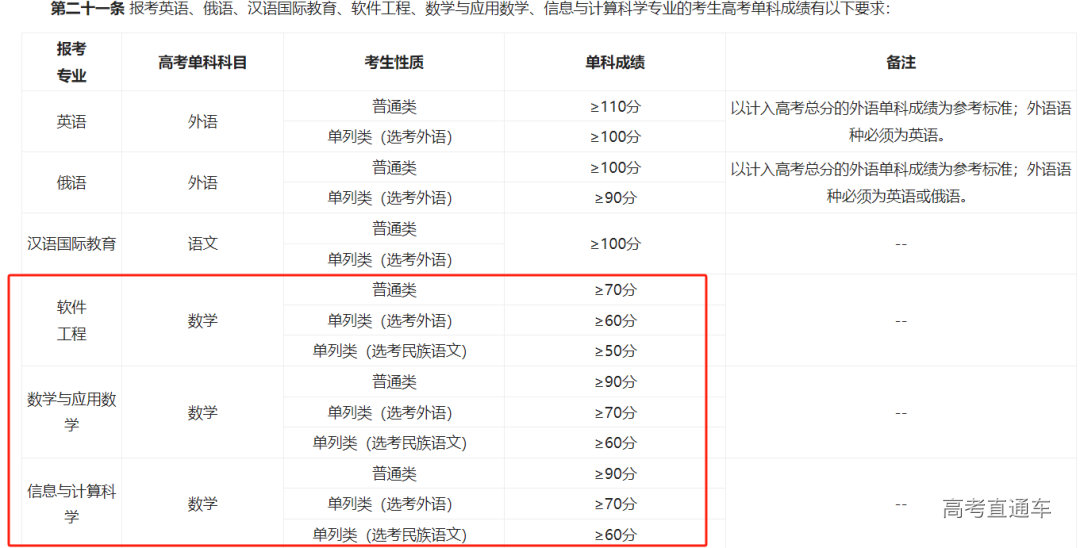 经济学门类专业包括:经济学类、财政学类、金融学类、经济与贸易类,这一类专业对数学基础要求比较高,都涉及到与经济、金融打交道,离不开数学的支撑。 不管是理论经济学类与应用经济学类,高等数学,线性代数,概率论与数理统计这些基础课程是跑不了的。 数学类专业主要包括数学与应用数学、信息与计算科学、数理基础科学、数据计算及应用等专业。 高等数学并不是初等数学的一种简单提升,而是以微积分和高等代数为基础的一个体系。对于这种纯粹的数学类专业,考生需要特别慎重,兴趣爱好、良好的基础和天赋是发展的关键。在枯燥又烧脑的数学世界里,普通人可能连一根头发都保不住~ 每一幢建筑的背后,都有一群建筑设计师在为它夜以继日地算各种数据。除了想象力,建筑设计师还必须了解建筑材料、力学、结构问题等一系列建筑知识。他们也需要学代数、微积分、线性规划、统计学、三角学…… 建筑学专业需要学的东西非常多,对数学的要求很高,涉及到的面也很广,除了数学基础知识,还需要掌握数学背后的理性思维,几何空间想象力,逻辑性等。 人工智能专业可以说是近些年冉冉升起的“新星”。 人工智能属于计算机科学的分支,主要任务是开发计算机程序来完成需要人类智能的任务,偏向于以机器算法为主的软件行业。 行业大佬有这样两个特征:一是数学底子很好,二是很熟练的程序员,二者缺一不可。 作为国内人工智能教育非常有代表性和前沿性的南京大学,其教学体系也非常具有参考意义:在南大的教学大纲中,各种数学课程占据了很大部分,包括数学分析、高等代数、离散数学、概率论与数理统计、最优化方法和数理逻辑等等。可见,数学不好,直接“劝退”。 数据科学与大数据技术专业是新兴热门专业,专业就业面广,就业率高,工作发展潜力巨大。随着社会的发展,大数据也被称为“21 世纪的新石油”。 大数据技术的意义不在于掌握庞大的数据信息,而在于对这些数据进行专业化处理,通过“加工”实现数据的“增值”,更好地辅助决策。 它是以统计学、计算机科学和数学作为三大基础支撑的学科。其中,统计学,数学的学习难度,对数学不好的学生来说,那就是灾难。 计算机类专业一直是理科生报考的热门专业,开设该类专业的院校分布在各个层次。 计算机类专业涉及数学的课程包括:高等数学、线性代数、概率论与数理统计、高级语言程序设计(如C、C++)、离散数学、数据结构等,想学好计算机,数学是基础。 计算机专业必须学会数学的逻辑,如果数学不好或厌恶数学,建议不要选这个专业。 此外,部分学校针对某些专业在报考条件上也有特别要求:单科数学成绩必须超过规定分数才能报考,一定要提前了解! 报考北京联合大学软件工程(实验班)、金融学(实验班)的考生高考外语成绩须达到110分(含)以上,数学成绩须达到100分(含)以上。报考应用心理学(师范)的考生高考语文、数学成绩须达到90分(含)以上。 宁波大学报考阳明创新班(理工)的考生要求数学单科成绩不低于120分。 报考学校理科试验班类(数学与应用数学)专业的考生,数学单科成绩不低于120分。 报考西藏大学物理学、数学与应用数学专业的考生,高考数学成绩不低于90分。 报考新疆大学软件工程的考生,数学不低于70分;报考机械类的考生,数学不低于80分;报考数学与应用数学、信息与计算科学、统计学、数据科学与大数据技术、智能科学与技术、电气工程及其自动化的考生,数学不低于90分。 报考西北民族大学数学与应用数学、财务管理、金融学、经济学专业的考生,高考数学成绩达到单科成绩满分的60%。 数学与应用数学专业要求考生高考数学成绩不低于100分(满分以150分)。 报考广东以色列理工学院数学与应用数学专业的考生高考数学成绩须达到100分及以上。 报考成都锦城学院的网络与新媒体专业,数学单科成绩原则上要求不低于100分,语文单科成绩原则上要求不低于100分。 1、我们在选择专业时,一定要提前了解自己的心仪专业,了解专业的主要学习课程、未来就业等多方面内容,了解清楚再结合自己的兴趣爱好及未来规划决定自己是否应该选择该专业。 2、对于部分院校报考有单科成绩要求的专业,在填报前一定要仔细看看该院校的招生章程,有单科成绩要求的专业一般都会在招生章程上说明。