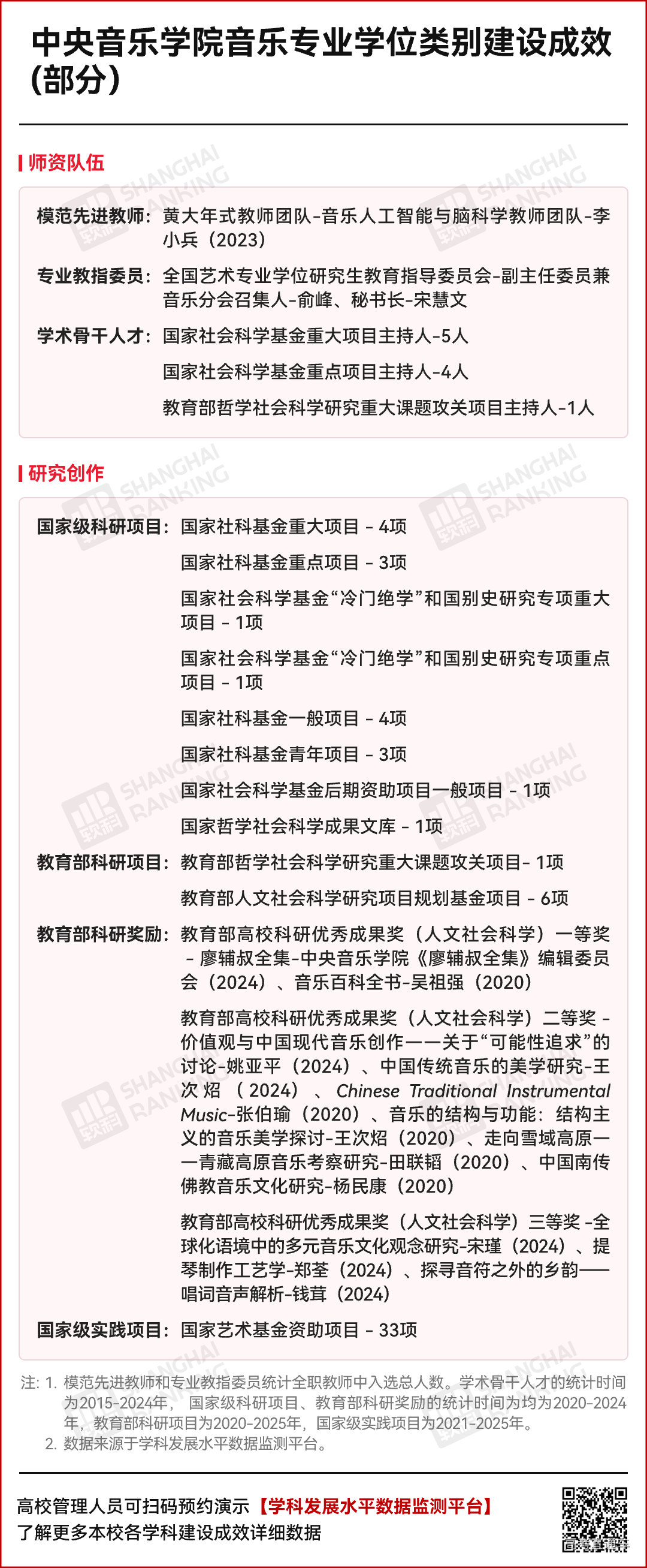 中央音乐学院是新中国成立后创办的第一所高等专业音乐院校,作为全国音乐教育、创作、表演和研究中心以及社会音乐推广中心,中央音乐学院是一所代表中国专业音乐教育水平,专业设置齐全,在国内外享有很高声誉的音乐学府。1981年被国务院批准为全国高校首批博士学位授予单位,1999年被列入国家“211工程”建设高校,2017年入选国家“双一流”建设高校。学校在音乐学科上硕果累累。