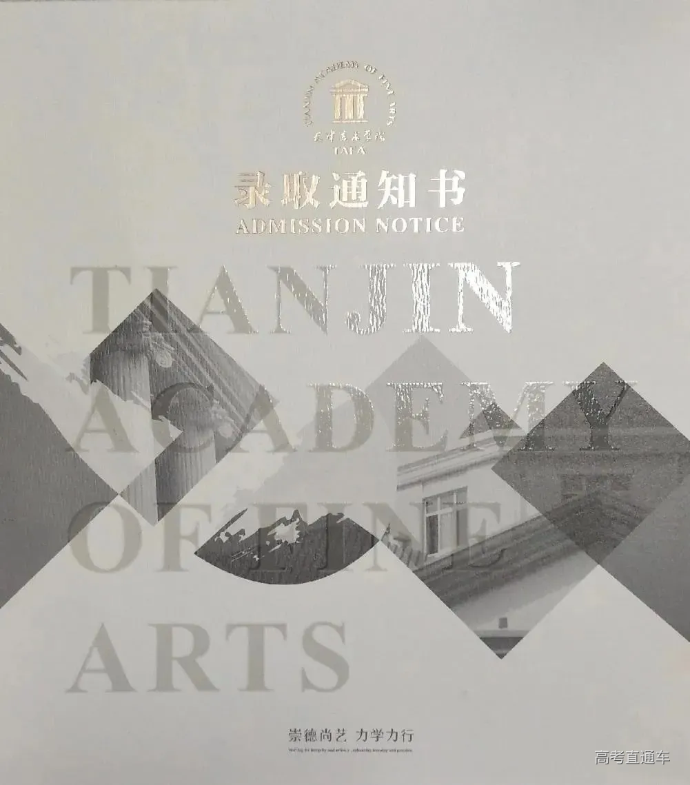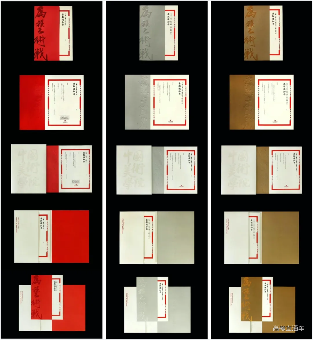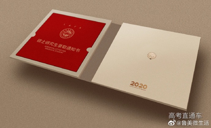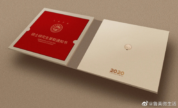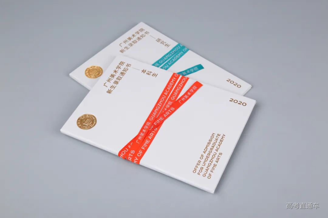 4 今年的广州美术学院 录取通知书是一个大礼盒 在设计上既有全新设计的录取通知书封页 还有面向世界的告白:“未来,就现在!” 红色是本科生,蓝色为研究生 除了精心设计的通知书 学校还专门送上寄语 信封以“TO 2020,乘风破浪的你”为题 信笺以暖心的关怀和殷切的嘱托为内容 并通过特别的设计 展现 “寻光而上,看见希望”的创意 这样精致又贴心的设计 5 湖北美术学院 今年湖北美术学院的 录取通知书与 百年校庆元素相结合,简约不失大气 通知书以经典的蓝白配色为主 结合百年校庆元素 一封信件承载着希望与祝福 给新湖美人带来一份憧憬和一份期盼 这封通知书拆开的不仅是一封信件 拆开的更是大学四年生活的开端 6 西安美院今年录取通知书 像是一封信笺,满载艺术底蕴 与西安美院的艺术精神一脉相承 今年的通知书采用 红白颜色搭配,整体简洁明快 红条白信封颇具威严 透过信封仿佛能目睹着西美峥 嵘岁月在纯净衰朽的时间里悄然流逝 打开后的“折子”里 隽秀的字迹宛如灵动的太极湖水 向新生缓缓流淌而来 表达着西美最真挚的欢迎 白底纸张上是纵向从右至左的字体排列 若你细细品味,似乎聆听到雁塔晨钟响遏行云 西美通知书的每个细节都饱含了西美对 每一位即将到来新生的用心 7 四川美术学院今年的 录取通知书简洁大方 精简的设计感体现了川美的艺术底蕴 也象征着众多川美学子在此 描绘着艺术的现在与未来 演绎着青春的激情与梦想 8 天津美术学院的通知书封面 是天美地标性建筑物 虽然也只有薄薄的一张纸 却承载着学院厚重的历史与希冀 望学子能砥砺前行,开拓新的未来 9 鲁迅美术学院 本科的通知书还没有发布 不过,大家可以先看看研究生的解解馋