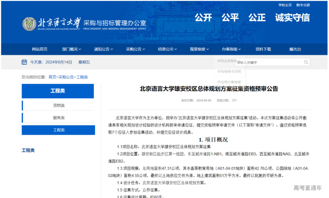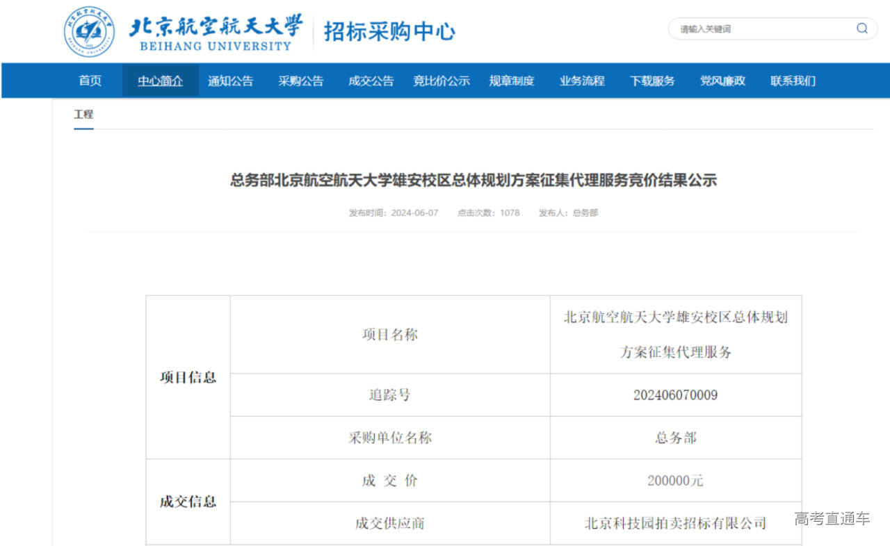 北京航空航天大学官网日前发布《总务部北京航空航天大学雄安校区总体规划方案征集代理服务竞价结果公示》,“官宣”了将建设雄安校区的最新消息。至此,又一所“双一流”(世界一流大学和一流学科)高校将疏解到雄安新区。