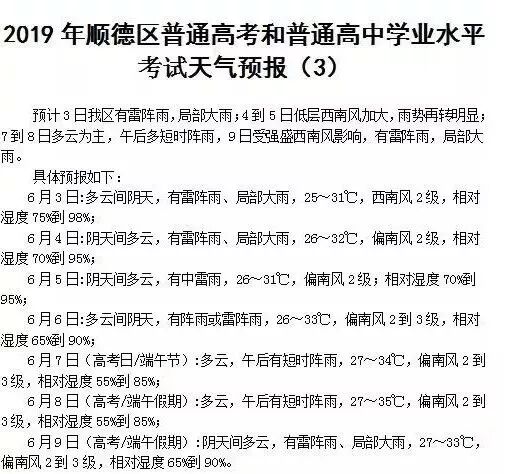 今年“龙舟水”期间(5月21日至6月20日)降雨较历史同期偏多,顺德气象台预计,未来几天天气不稳定,雷雨频繁。大家记得做好防风防雨防雷措施。 考试期间,7到8日多云为主,午后易出现短时阵雨,日间气温较高,请注意防晒防暑,及时补充水分。9日受强盛西南风影响,降雨趋明显,请随身携带雨具,考试路上注意交通安全。 与前段时间的连场暴雨相比,阵雨天气听起来没有那么恐怖,但不可预测性也会更强。各位备战高考的考生们,届时出行要做好应对极端天气的防范措施哦!