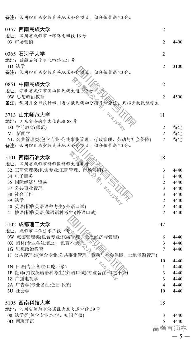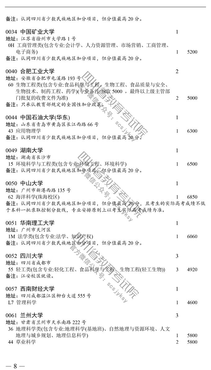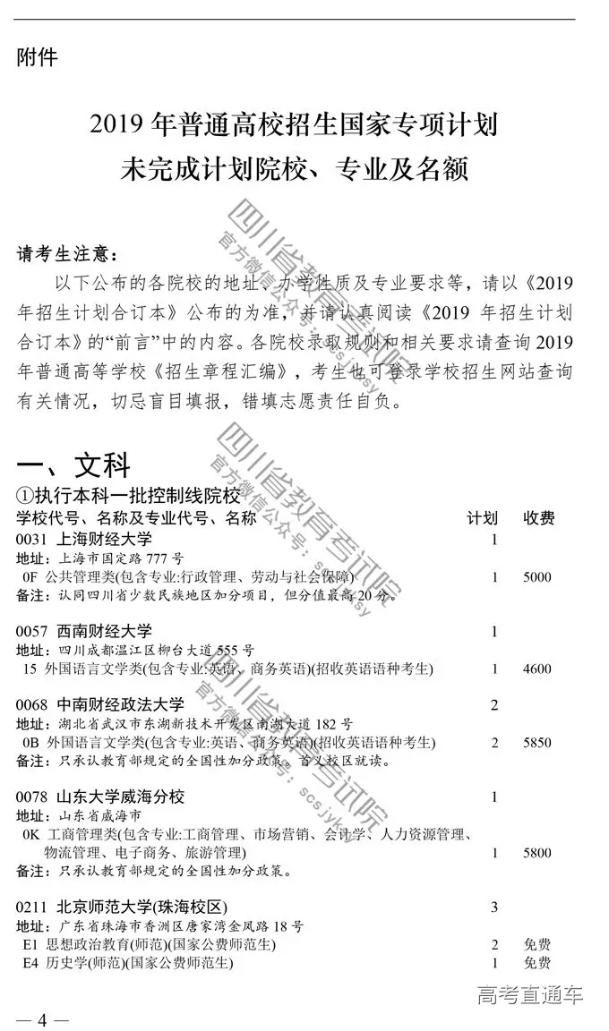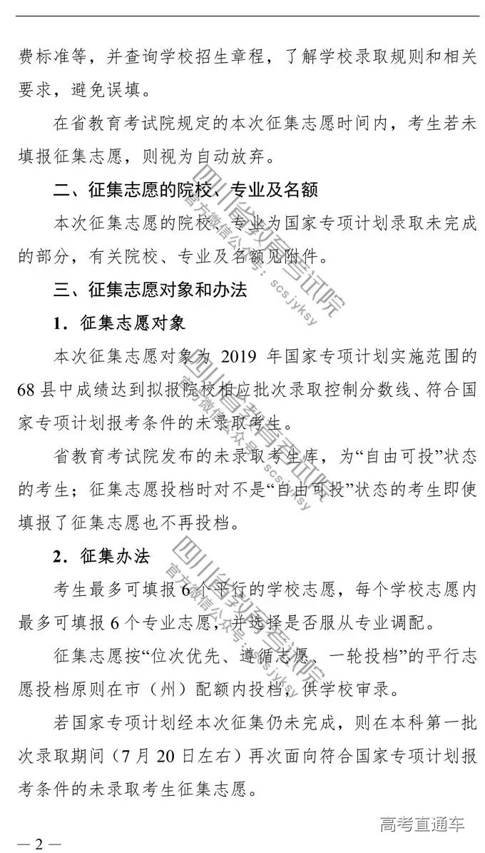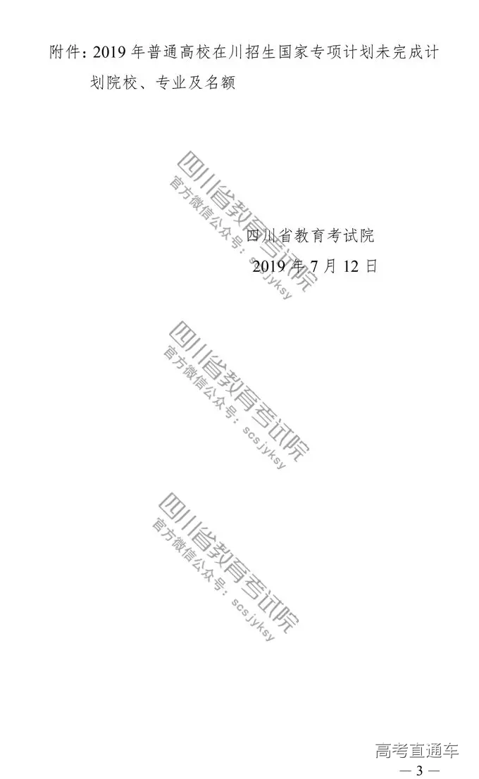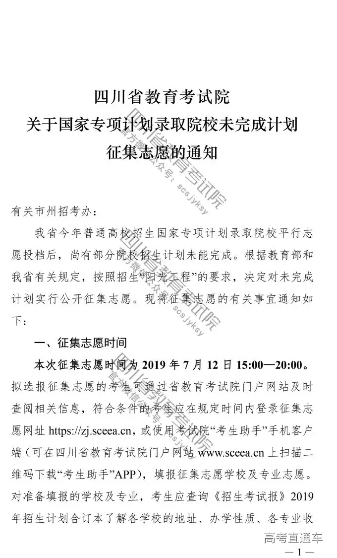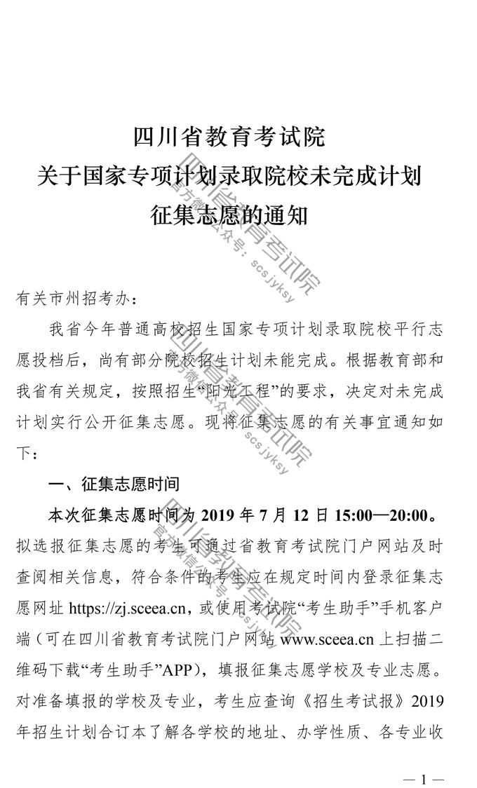 四川省2019高考国家专项计划录取院校未完成计划征集志愿的通知