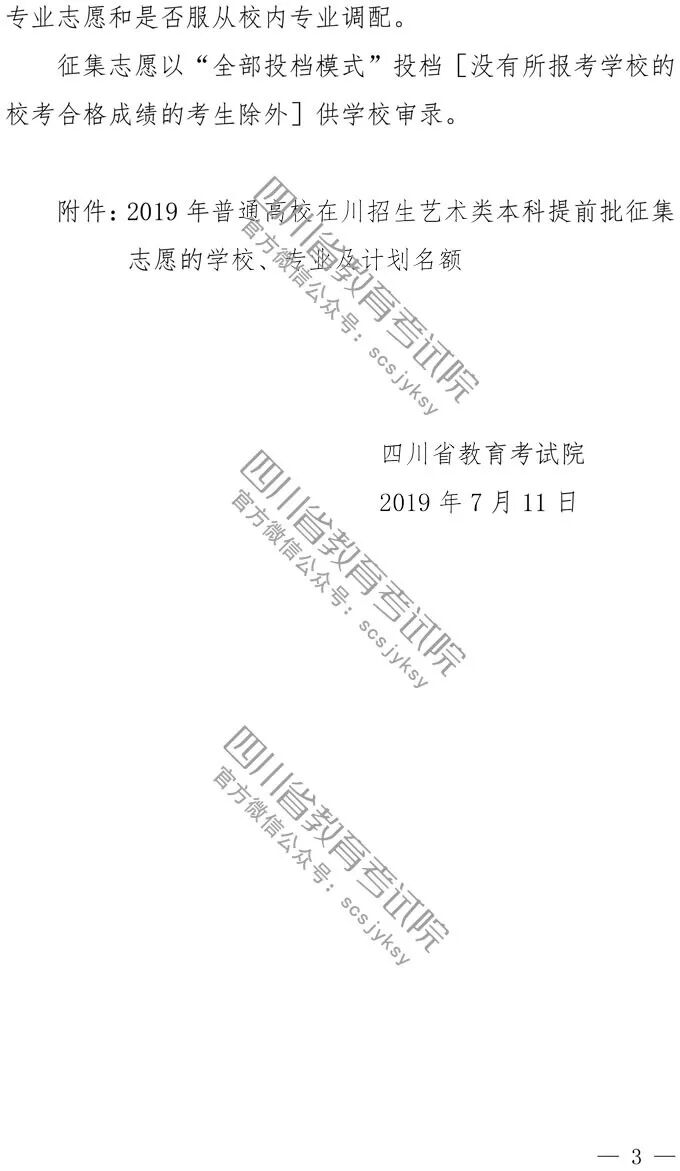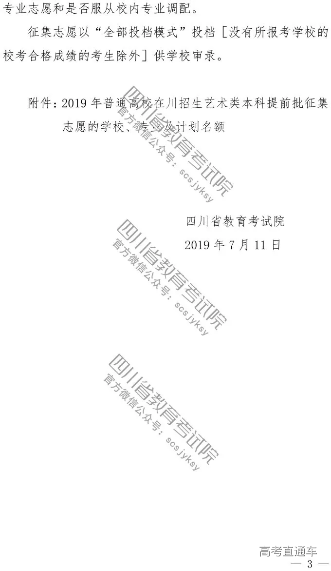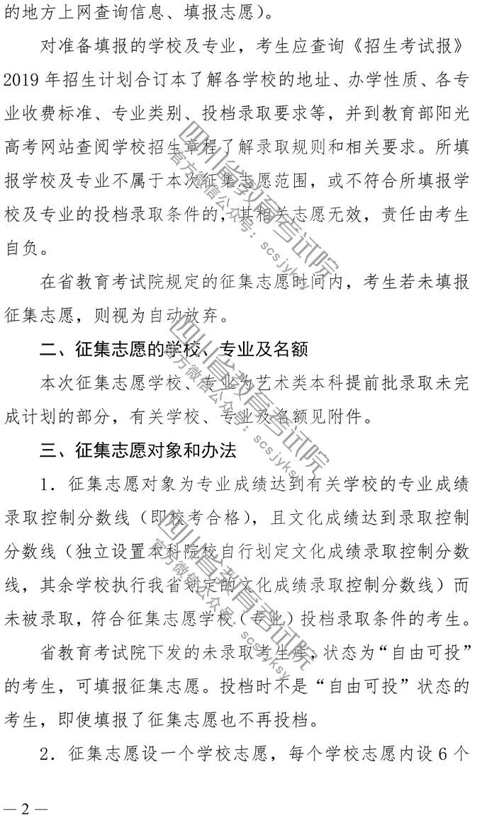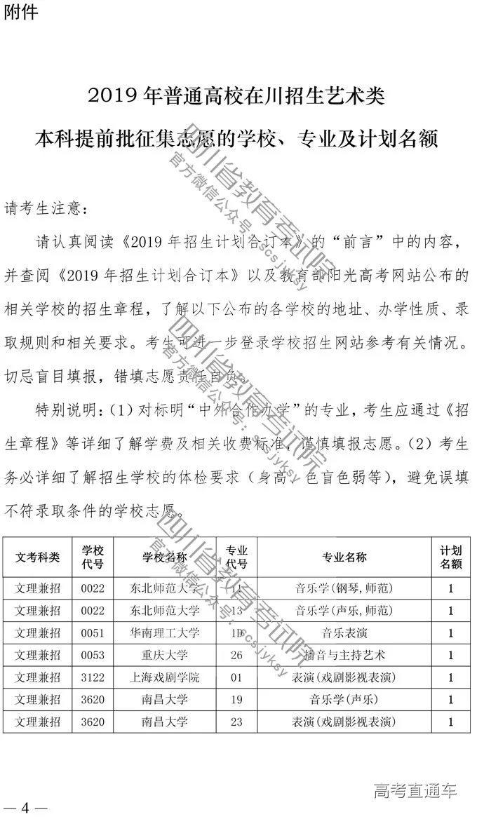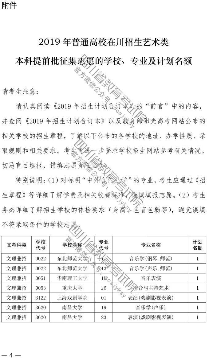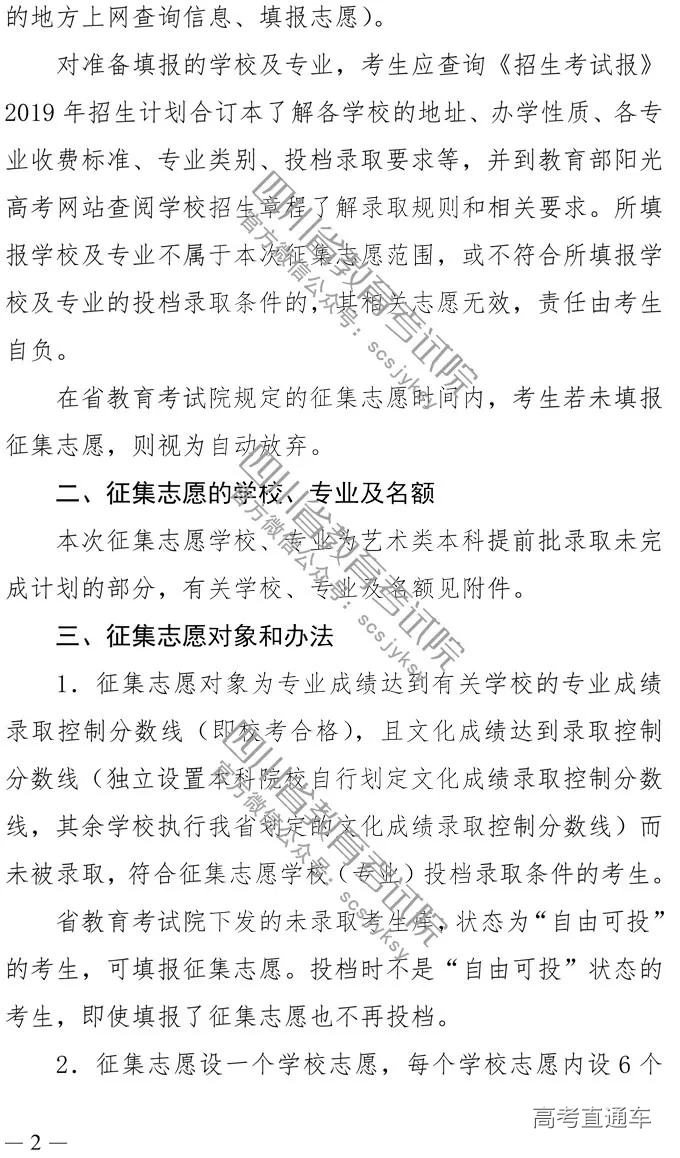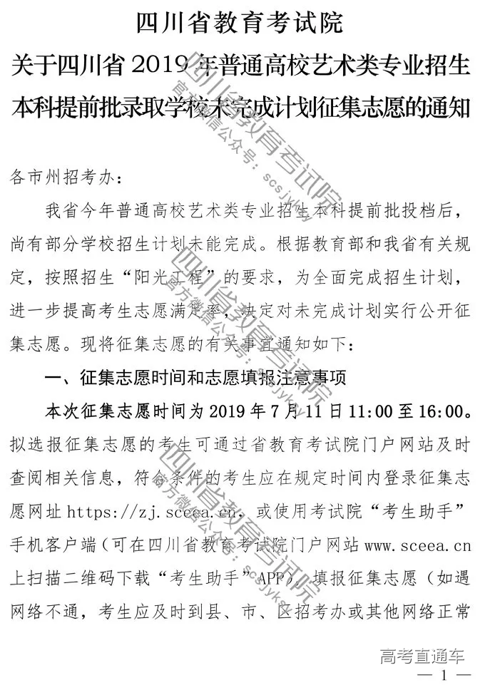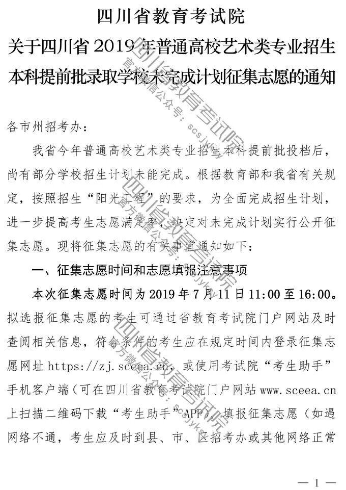 2019四川关于普通高校艺术类专业招生本科提前批录取学校未完成计划征集志愿的通知