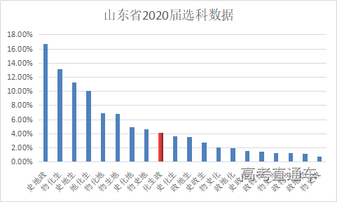 “3+3”模式下,考生可在20种组合中选择,化生政受欢迎度不高。以下为山东省2020届高三选科数据情况,化生政组合选考排名位列第9,选考热度一般,一般为中等成绩考生的选择。