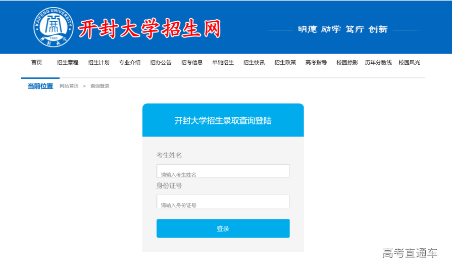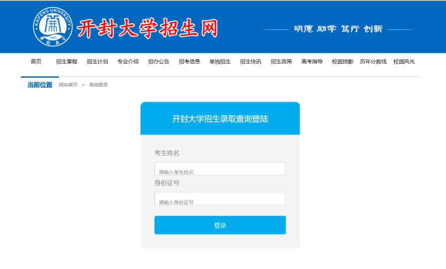 登录开封大学官网(http://www.kfu.edu.cn),点击导航栏“招生就业”,进入开封大学招生网,点击“录取查询”,进入查询界面,正确输入考生信息后,点击“查询”即可查看录取结果。