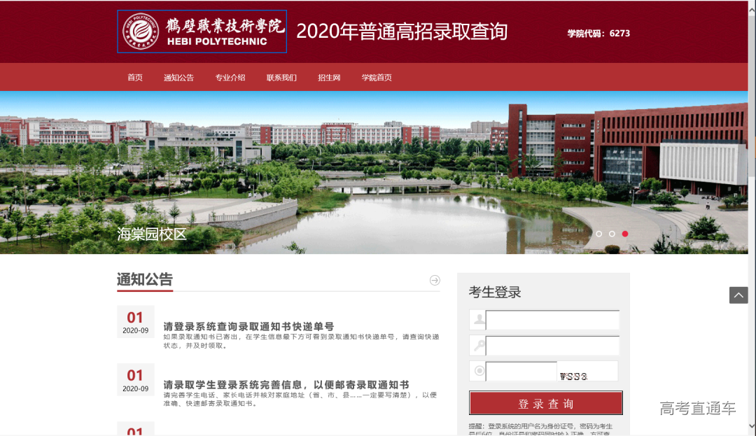 登录鹤壁职业技术学院官网(http://www.hbzy.edu.cn),点击导航栏“招生就业”中“招生信息网”,进入鹤壁职业技术学院招生信息网,点击页面右侧的“2020年普通大专录取查询”,进入查询界面,正确输入考生信息后,点击“登录查询”即可查看录取结果。