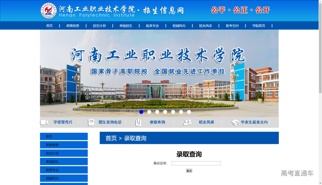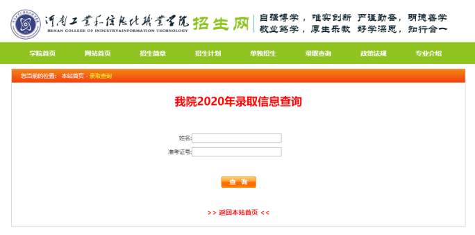 登录河南工业职业技术学院官网(http://www.hnpi.edu.cn),点击导航栏“招生就业”中“招生工作”,进入河南工业职业技术学院招生信息网,点击页面的“录取查询”,进入查询界面,正确输入考生信息后,点击“查询”即可查看录取结果。