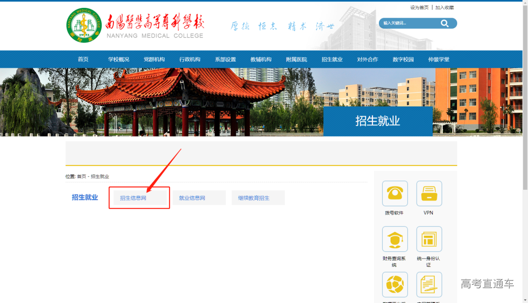 登录南阳医学高等专科学校官网(http://www.nymc.edu.cn),点击导航栏“招生就业”中“招生信息网”,进入南阳医学高等专科学校招生信息网,点击页面右侧的“2020年录取查询”,进入查询界面,正确输入考生信息后,即可查看录取结果。