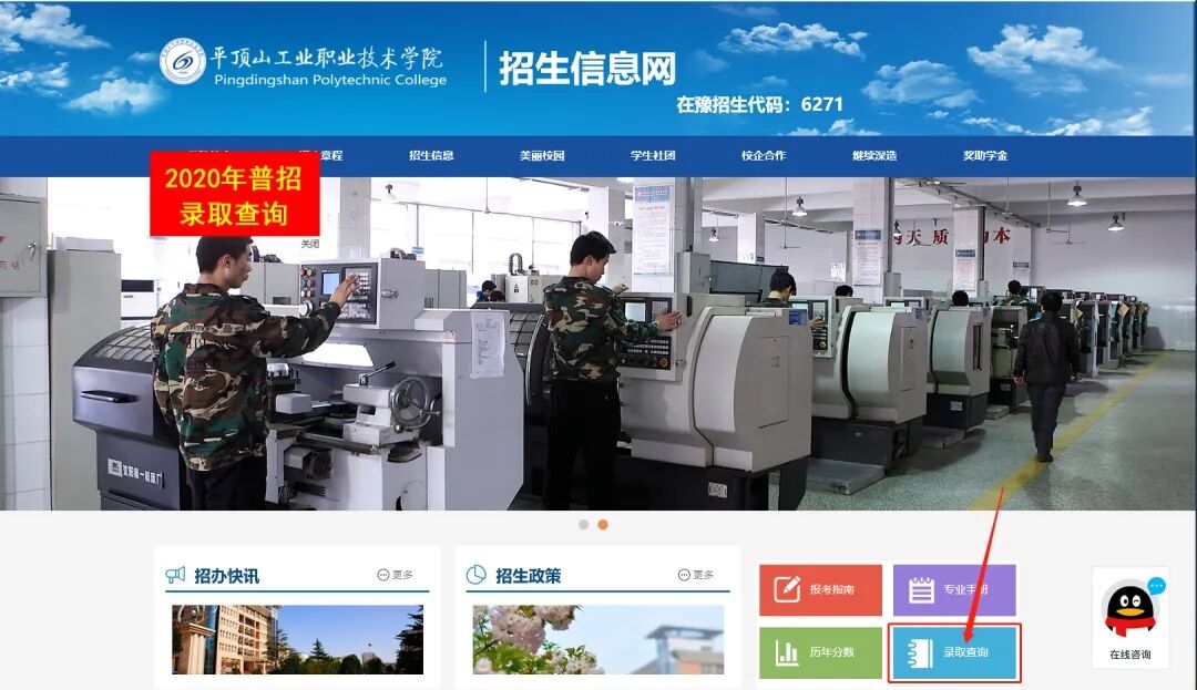 登录平顶山工业职业技术学院官网(https://www.pzxy.edu.cn),点击导航栏“招生就业”中“招生信息网”,进入平顶山工业职业技术学院招生信息网,点击页面右侧的“录取查询”,进入查询界面,正确输入考生信息后,点击“查询”即可查看录取结果。