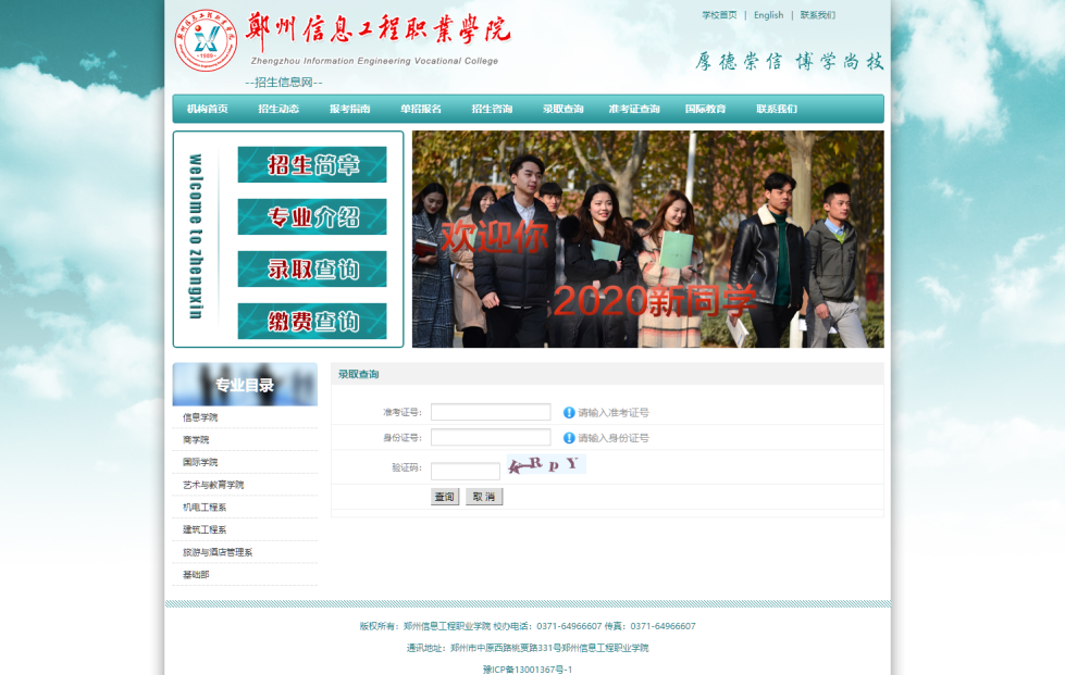 登录郑州信息工程职业学院(http://www.zxxyedu.com)官网,点击导航栏“招生就业”点击“招生信息”,进入郑州信息工程职业学院招生信息网,点击页面左侧的“录取查询”,进入查询界面,正确输入考生信息后,点击“查询”即可查看录取结果。