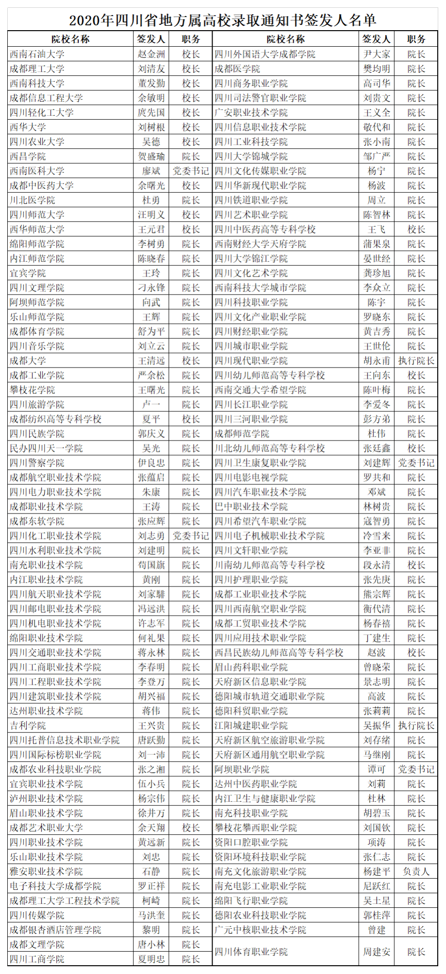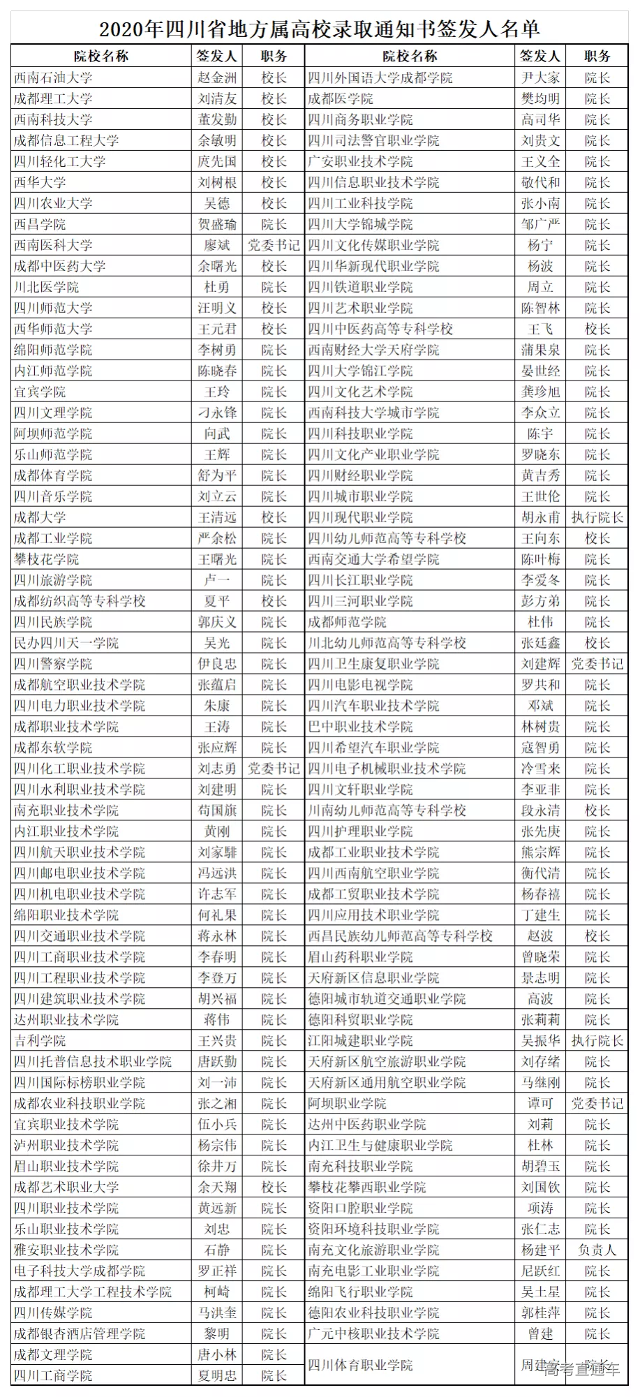 先前西南中学生为大家介绍了辨别录取通知书真伪的几个方法,其中一项就是“看校长签名”。四川省教育考试院今日公布了四川地方属高校录取通知书的签发人名单,是各位考生鉴别真伪的重要依据。