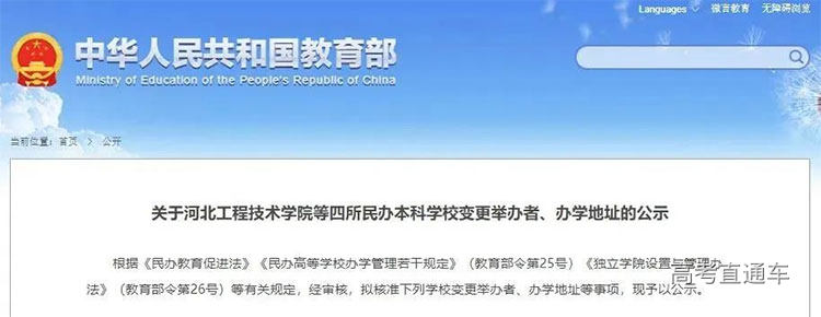 8月19日,教育部发布《关于河北工程技术学院等四所民办本科学校变更举办者、办学地址的公示》。