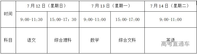 其中,普通高中招生考试科目为语文、数学、英语、综合理科(理化合卷)、综合文科(政史合卷)、体育;其中语文、数学、英语、综合理科、综合文科考试时间为7月12日—14日,具体安排如下: