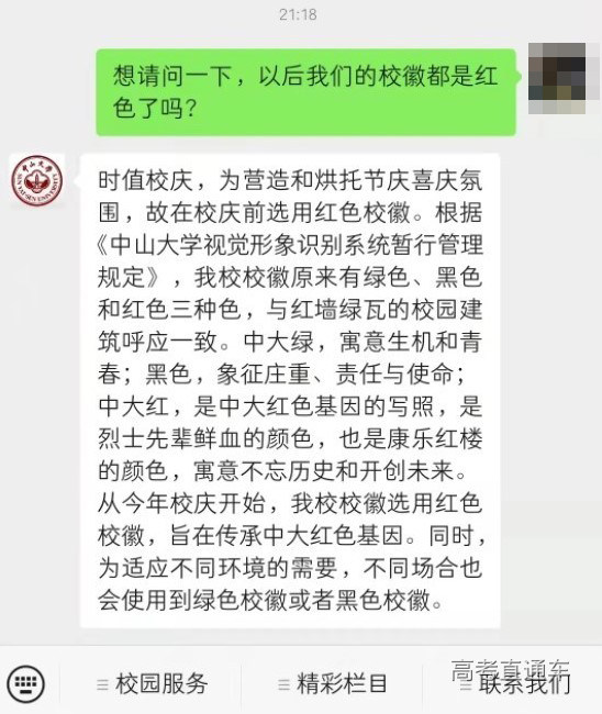 这名网友向中山大学官方微信公众号留言询问是否以后校徽都是红色版本,得到的回复称:“时值校庆,为营造和烘托节庆喜庆氛围,故在校庆前选用红色校徽。根据《中山大学视觉形象识别系统暂行管理规定》,我校校徽原来有绿色、黑色和红色三种色,与红墙绿瓦的校园建筑呼应一致……从今年校庆开始,我校校徽选用红色校徽,旨在传承中大红色基因。同时,为适应不同环境的需要,不同场合也会使用到绿色校徽或者黑色校徽。”