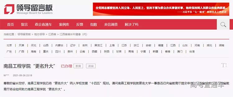 近日,有网友在人民网领导留言板询问南昌工程学院“更名升大”的进展情况。对此,江西省教育厅回复表示,已组织省高评委会就南昌工程学院“更名升大”事宜进行审议,并积极向教育部争取支持。