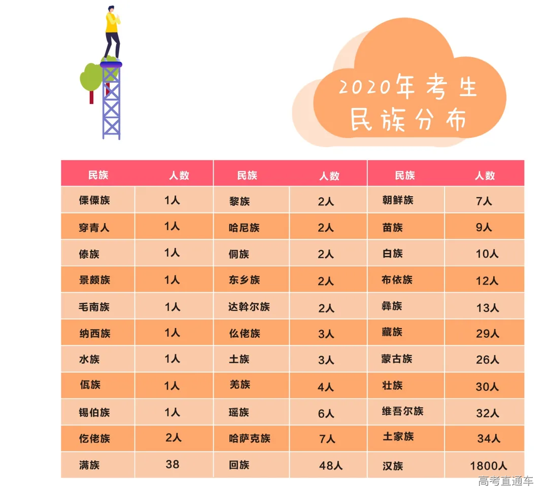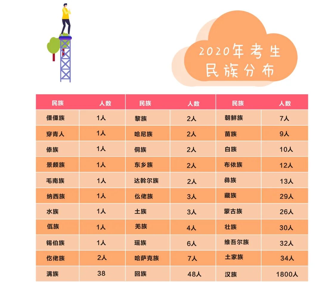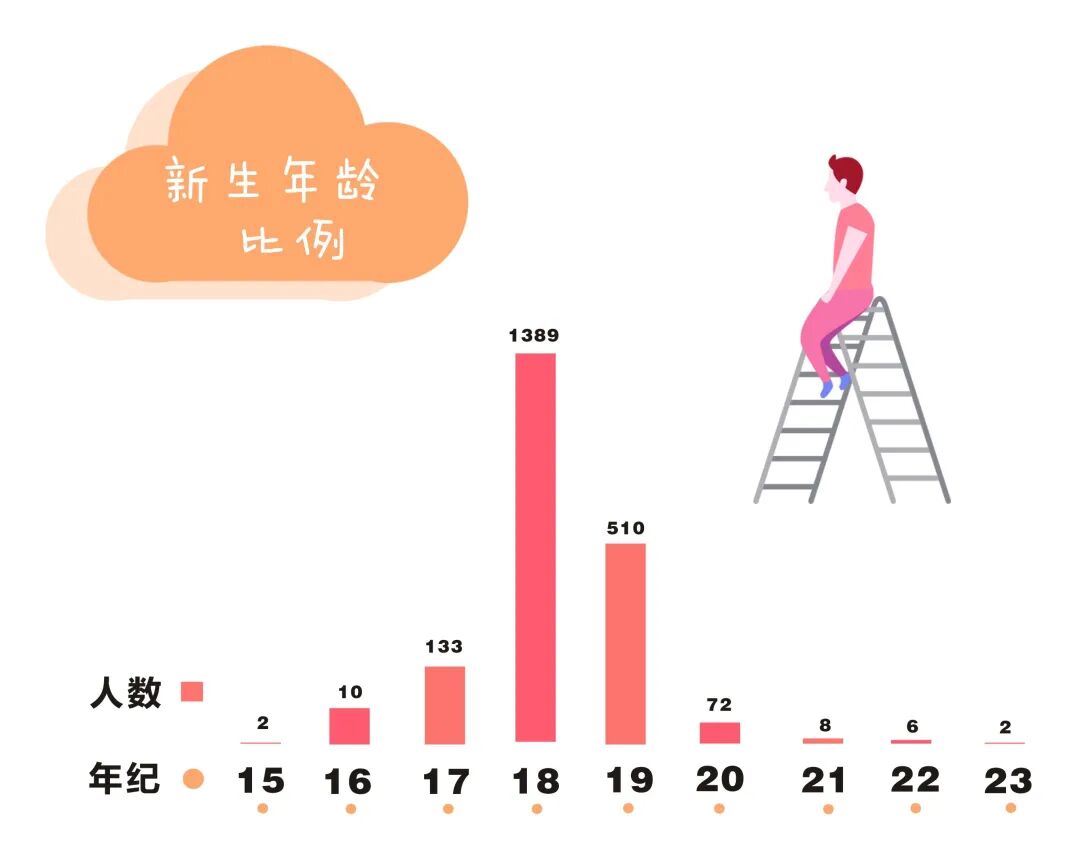 2020年, 法大共有2132名小萌新 来到校园在美丽的军都山下 开启大学四年的新生活! 56个民族,56枝花 今年法大新生的民族分布 也呈现出了多样化的态势 你的班上,有少数民族同学吗? 2020级新生已经是“00后”的天下, 绝大多数的本科新生, 都诞生在2000年以后 你们是真正的“千禧一代” 不过今年最小的本科新生只有15岁? 后浪们,今后看你们的啦! 我们为大家统计出了 各个专业的男女比例, 不难看出, 法大今年依旧是“女多男少”的状态, 各个专业平均男女比例大约是3:7, 男同胞们,守护女同学的重任 今后就交给你们啦! 2020级新生的姓氏中 王、李、张、刘 占据了前四位 看看你的高中母校 有没有上榜? 今年的小萌新 星座比例相对平均 人数最多的是双子座 人数最少的是白羊座 你是什么星座呢? 四年四度军都春,一生一世法大人 希望2020级的小萌新 都能在美丽的军都山下 收获美好的四年大学生活 加油,法大人!
