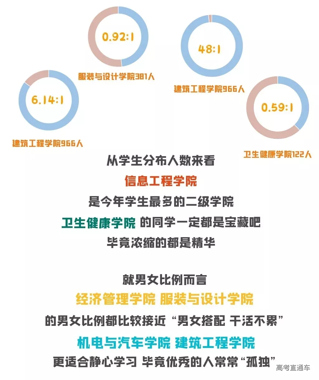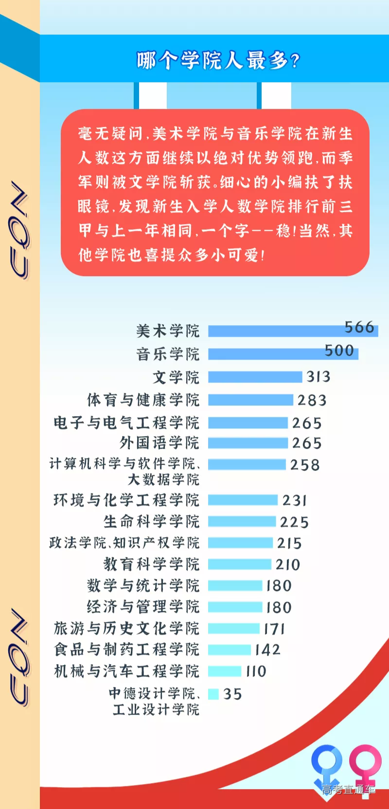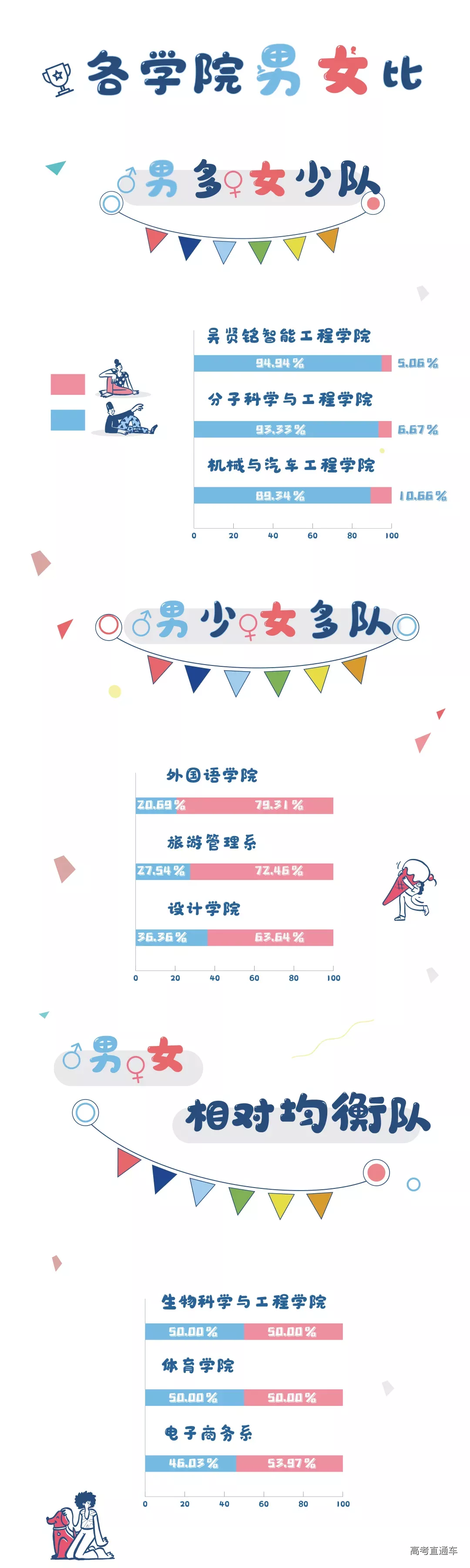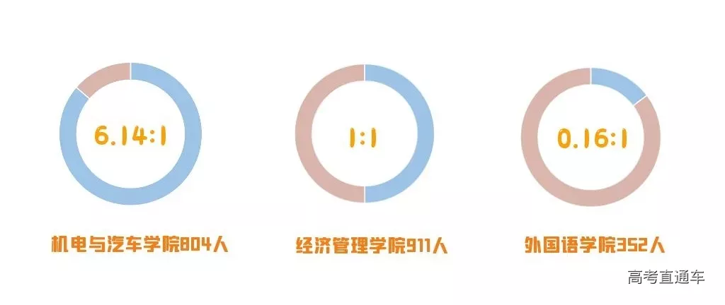 毫无悬念的是,男女比例出现两极分化趋势,文科类学院普遍女多男少,反之理工科类学院男多女少。