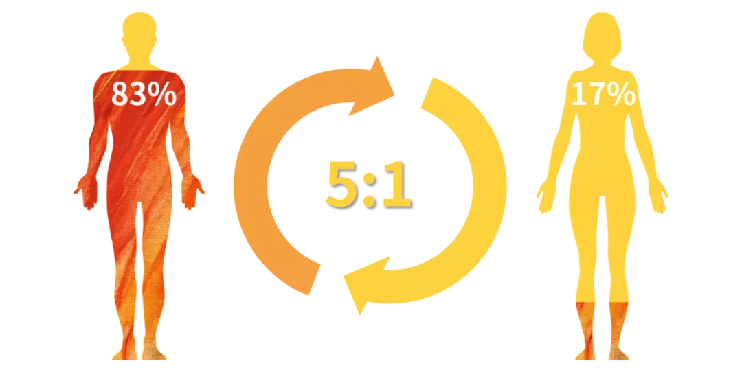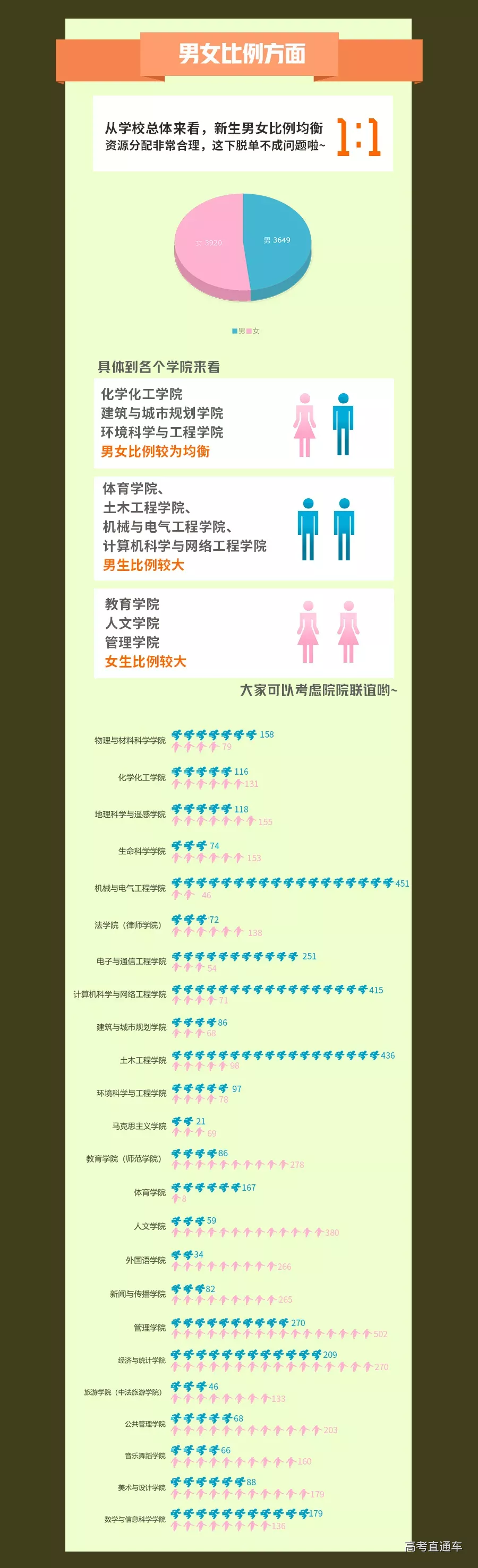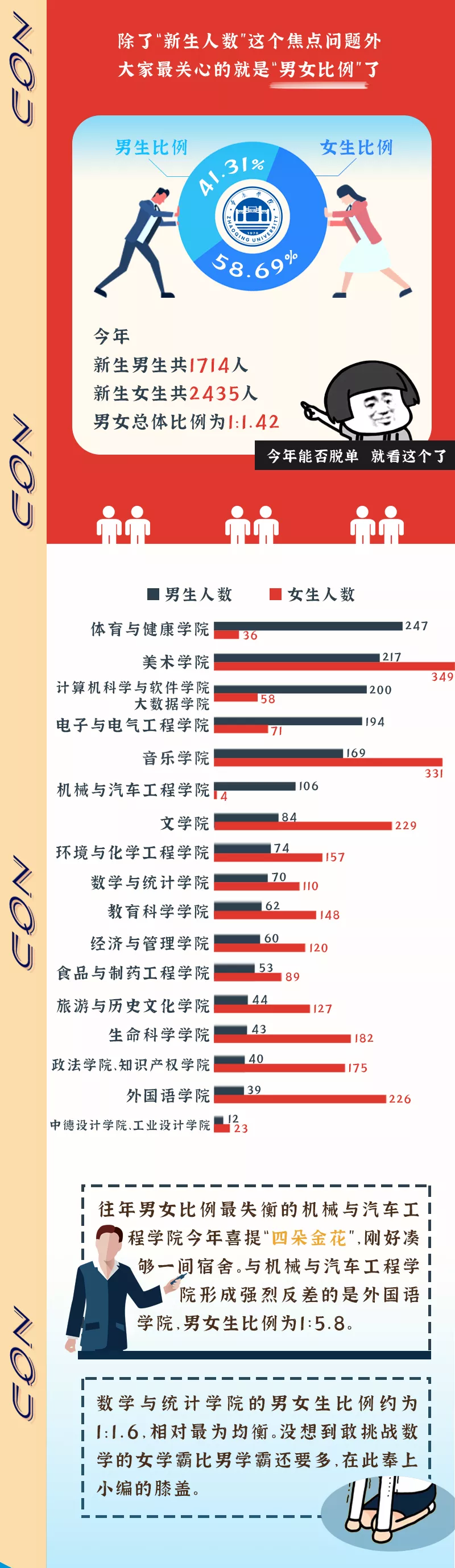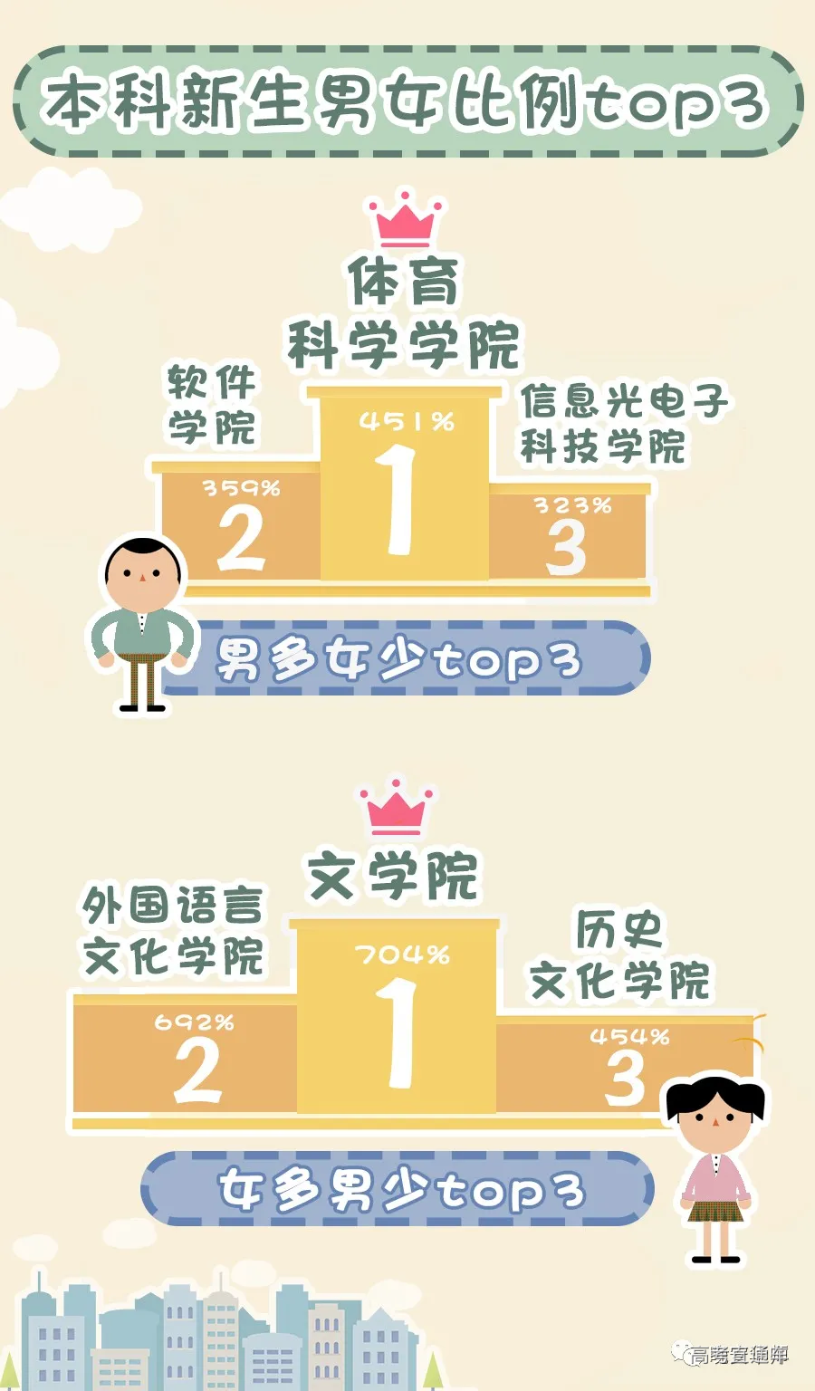 体育科学学院男女比例4.51:1,两个女生顶九个男生;文学院男女比例1:7.04,一个男生与七个女生一同遨游诗词的海洋。