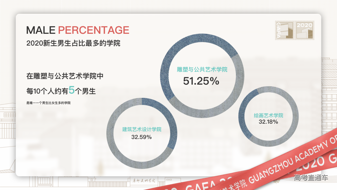 今年女生比例最高的为艺术与人文学院,而雕塑与公共艺术学院仍是今年男生占比最高的学院。