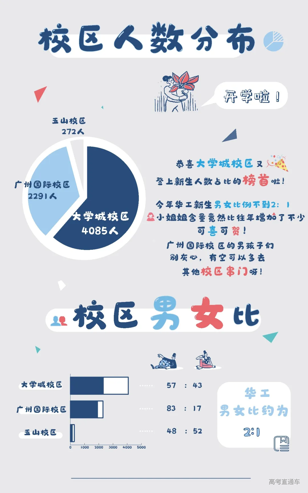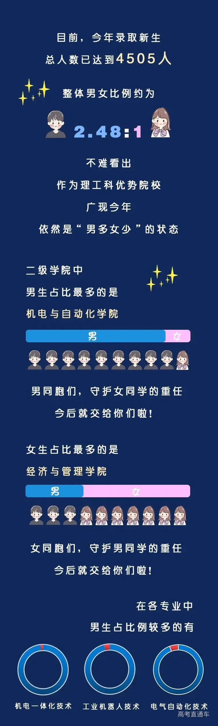 广工2020级本科生男女比例基本与去年持平,2020级本科生新生中,男生6845名,女生2673名,全校男女比例为2.56:1。没有传说中的7:1或12:1这么恐怖,请大家相信科学、相信数据~