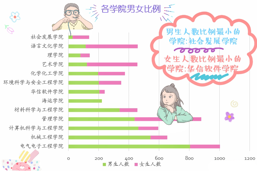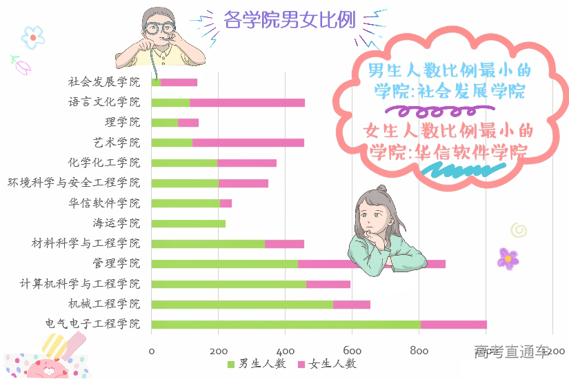 语言文化学院和艺术学院的女生比例旗鼓相当