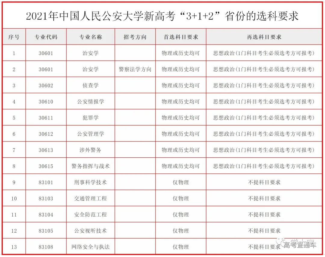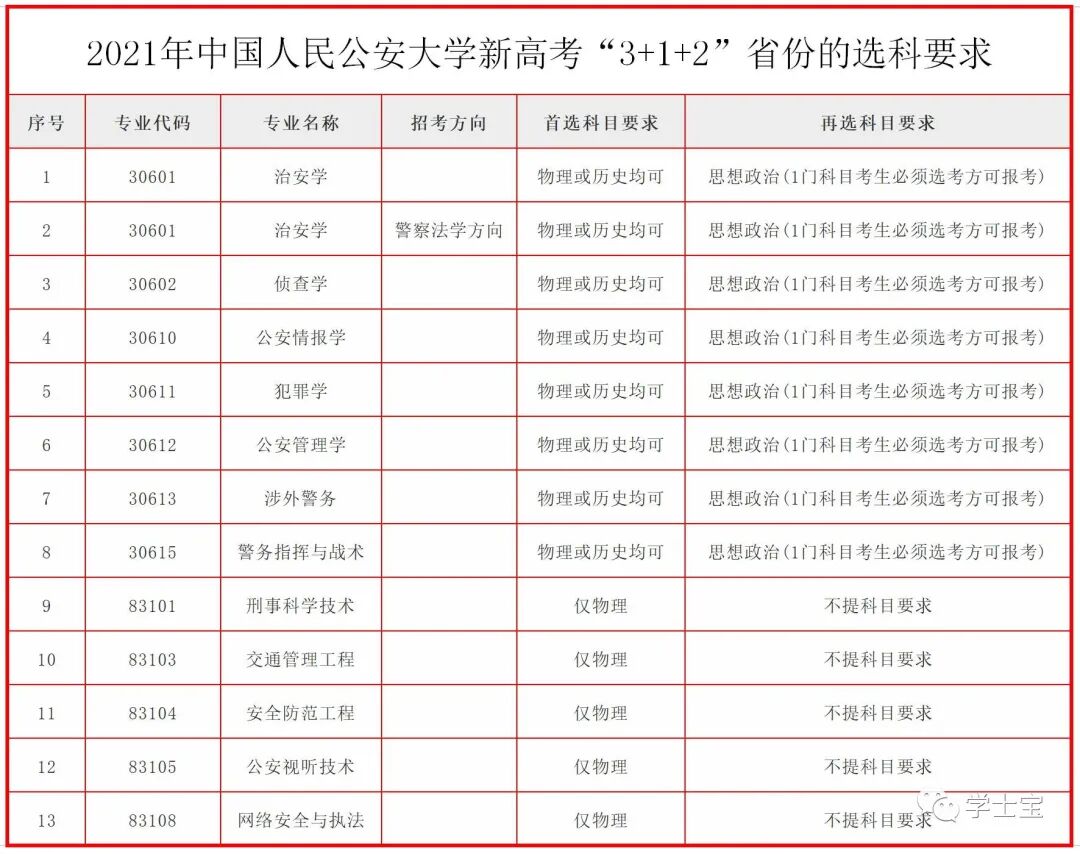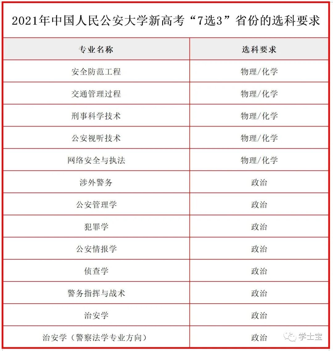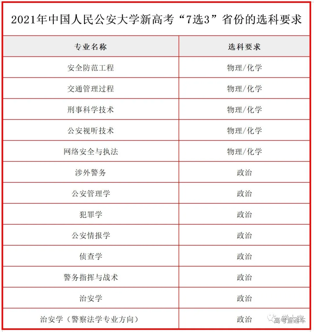 1、2021年中国人民公安大学新高考“7选3”省份的选科要求:
