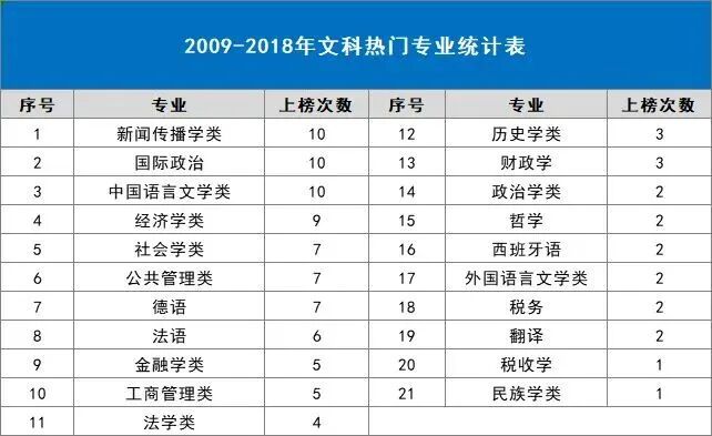 01 新高考能改变文、理科差距吗? 无论是“3+1+2”还是“3+3”的选考模式,选考理科类科目都能覆盖大部分专业,尤其物理几乎覆盖了一半专业。 所以,即使物理是一个很难学的科目,仍有很多偏文科方向的学生还是不得不选考物理,来保证专业覆盖率。但新高考的实施,还是在一定程度上给很多文科类考生一个“翻身”的机会。 老文综组合(史政地)的专业覆盖率大体来讲为52.9%,但如果在文科有优势的考生能选择两个文科搭配一个理科的选考组合,这样能规避一定程度上的专业覆盖的问题。例如选择历史、政治+化学后,专业覆盖率能提升至80%左右,这与一些理科组合的专业覆盖率相比也丝毫不逊色。即使选择搭配较难的物理,和其他理科类偏多的组合相比,赋分还是可以占到优势。 02 除了选科,文科类考生还能在哪下工夫? 01 重视志愿填报,把握文科类优势专业 2009-2018年文科、偏文科十大热门专业榜单,共计21个热门专业。其中,国际政治、新闻传播学类和中国语言文学类每年都入选,排名靠前;经济学类仅在2011年落选十大热门,但是有5年排名第二,受欢迎程度可想而知。 数据来源于网易数据 2019年-2020年文科类热门专业有: 02 重视综合成绩 不管是参加强基计划、综合评价还是高校专项等特招,综合成绩水平都是升学的核心要素,要重视高中时期的每次大型考试,成绩优异意味着可以有更多的优势选择重点大学和专业。 03 注重人文素养,竞赛奖项依然有用 虽然近年来,一直有“凉竞赛”的说法,但还是有不少文科类及科创类的奖项收到高校认可,能在一些特殊类招生中发挥优势。 学有余力或是感兴趣爱好的考生,也可以参加作文大赛、英语竞赛、科创比赛等,拿到一定奖项对高三报考强基计划、综合评价、高校专项等是锦上添花。