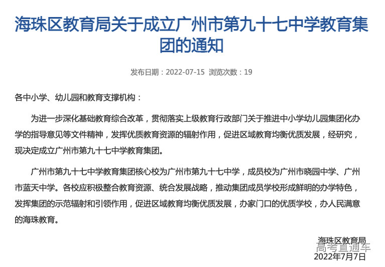 7月15日,海珠区人民政府网发布《海珠区教育局关于成立广州市第四十一中学教育集团的通知》《海珠区教育局关于成立广州市第九十七中学教育集团的通知》(以下简称《通知》)。