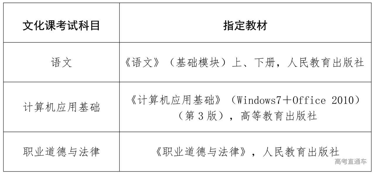 1.文化课考试方式。文化课采取笔试的考试方式,实行全省统一命题、统一考试、统一评卷,由省考试局负责组织实施。考试内容为我省中职学校所开设课程的基本知识,各科指定教材详见下表: