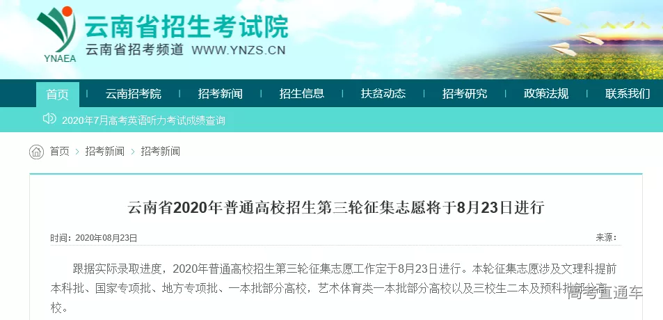 云南省2020年普通高校招生第三轮征集志愿将于8月23日进行