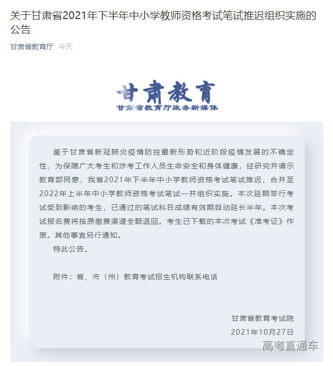 10月27日,甘肃省教育考试院发布《关于甘肃省2021年下半年中小学教师资格考试笔试推迟组织实施的公告》。鉴于甘肃省新冠肺炎疫情防控最新形势和近阶段疫情发展的不确定性,为保障广大考生和涉考工作人员生命安全和身体健康,甘肃省2021年下半年中小学教师资格考试笔试推迟,合并至2022年上半年中小学教师资格考试笔试一并组织实施。本次延期举行考试受到影响的考生,已通过的笔试科目成绩有效期自动延长半年。本次考试报名费将按原缴费渠道全额退回。考生已下载的本次考试《准考证》作废。其他事宜另行通知。