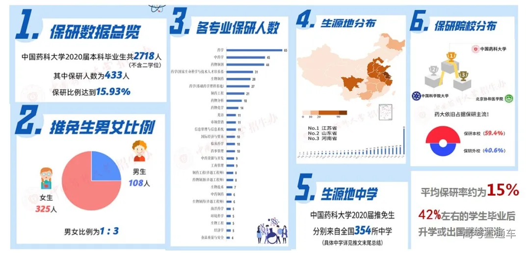 A:2019届本科毕业生升学率近43%。在长三角、珠三角、成渝经济圈等沿海、沿江经济发达省份、城市等医药产业集聚地带就业的学生比例近80%。毕业生到国家机关、高校、科研院所、国内知名创新型单位、全球医药50强和国内制药工业100强等头部单位就业的比例超过70%。选择药学类专业,可以成为政府党政机关重要部门负责人。中国药大的毕业生中也不乏以部长、省长、省市食品药品监督管理局局长为代表的党政机关各级领导。可以成为创新创业的企业家。可以成为国家药物政策专家。在现任国家药典委员会委员中,我校毕业校友占五分之一。在最近国家药品监督管理局药品审评中心公布的第一批外聘专家名单中,我校入选教授占高校专家的十分之一。