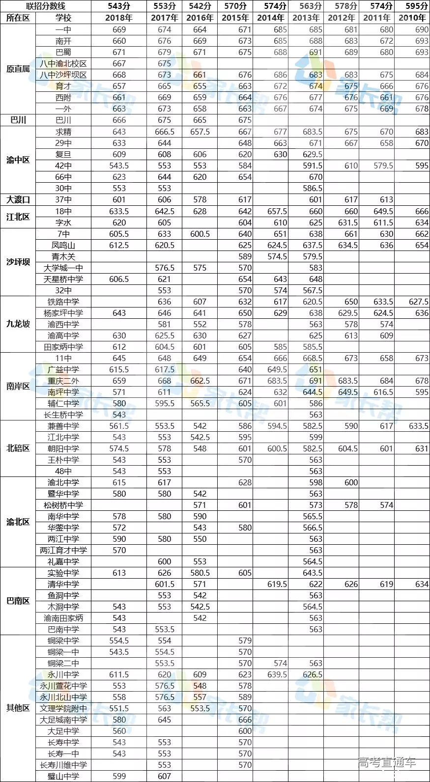 重庆市第一中学:672 重庆市南开中学:668 重庆八中小龙坎校区:670 重庆八中渝北校区:669 重庆市巴蜀中学:671 西南大学附属中学:667 重庆外国语学校:667 重庆市育才中学:663 重庆市求精中学:649 重庆市二十九中:639 重庆市十一中:645.5 重庆市两江育才中学:610 重庆市第七中学:625 重庆市朝阳中学:591