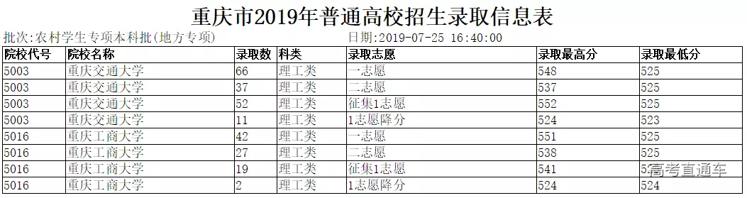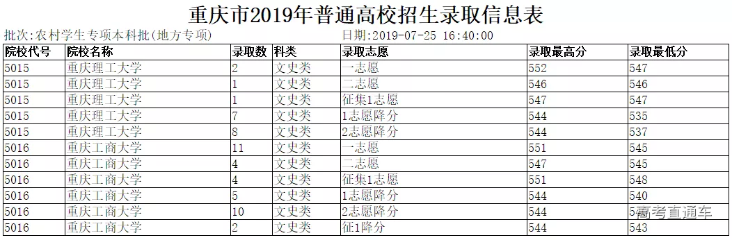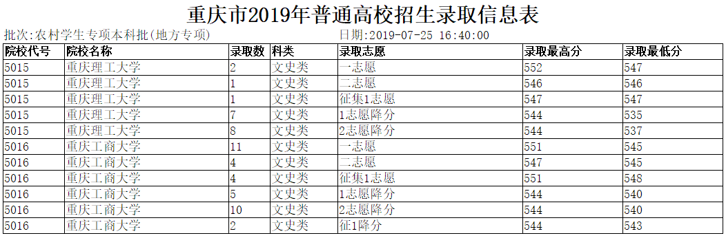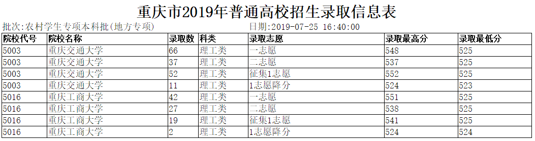 重庆市2019年普通高校招生录取信息表 农村学生专项本科批(地方专项)(二)