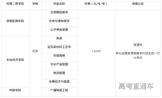 汉语国际教育、英语、文物与博物馆学、宝石及材料工艺学、广播电视工程、市场营销、文化产业管理、公共事业管理、物流管理、会展经济与管理、财务管理、会计、市场营销、会展策划与管理、汉语、旅游英语、文秘专业:参加全国普通高等学校招生统一文化考试。