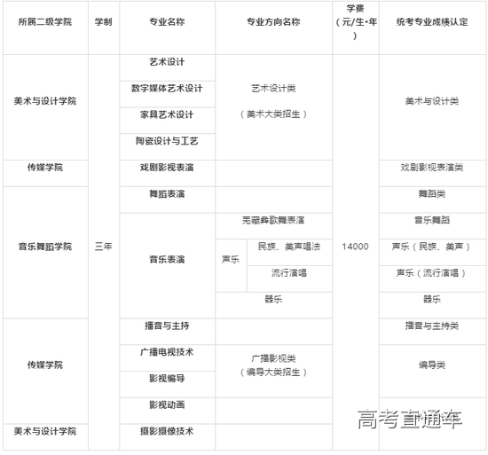 参加全国文化统考的文化类考生和艺术类考生根据自身高考成绩和艺术类专业成绩按要求填报本科、高职(专科)层次志愿;文化类考生可填报我校普通并轨本科和高职(专科)志愿;艺术类考生可填报艺术并轨本科和艺术高职(专科)志愿外,还可填报普通并轨本科和高职(专科)志愿。