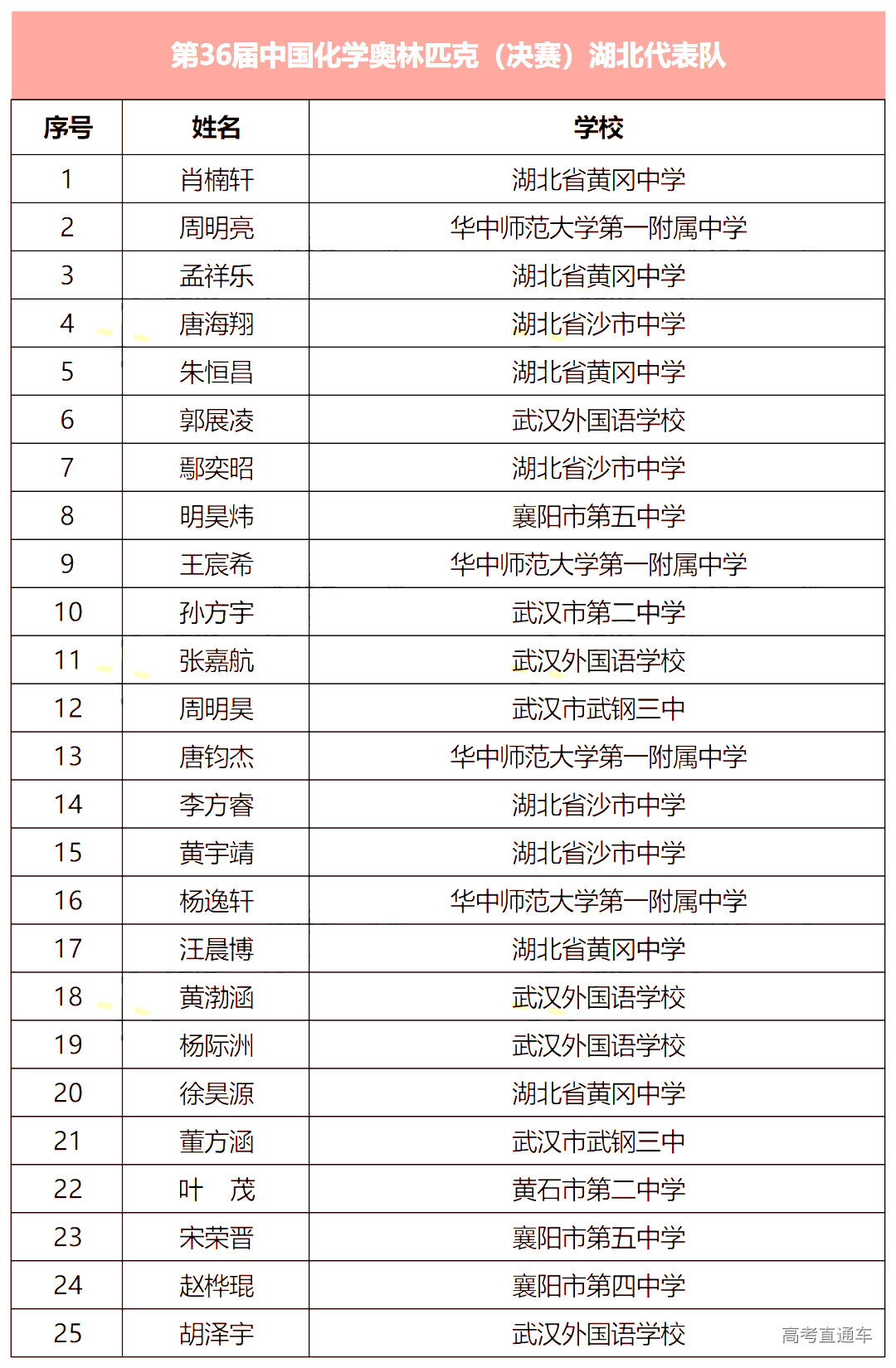 第36届全国中学生化学竞赛决赛省队名单(湖北)