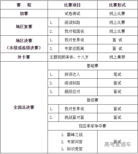 3.外卡赛为大赛组委会特设的网络专用通道,完成大赛报名的选手均可参加。外卡赛为视频演讲集赞活动,参赛学生在活动开放期间登录外卡赛专区按要求上传演讲视频。投票期内获赞票数前十名学生直接晋级全国总决赛。