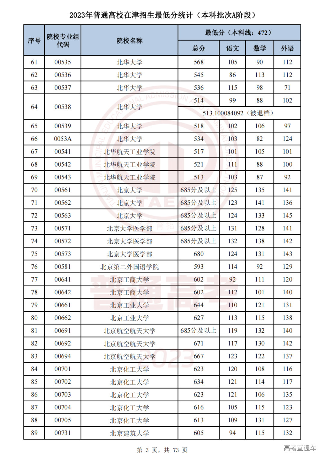 2023年录取最低分数线达到685分及以上的有清华大学、北京大学(含北京大学医学部)、北京航空航天大学、复旦大学(含复旦大学医学院)、南京大学、上海交通大学(含上海交通大学医学院)、四川大学、浙江大学(含浙江大学医学院)、中国科学技术大学、中国人民大学等10所院校28个院校专业组。该部分院校专业组的录取情况,考生可向招生院校咨询。