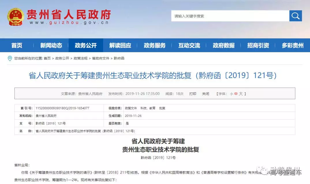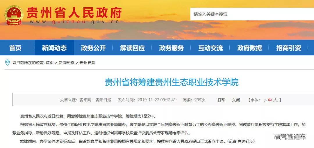 2019年11月26日,贵州省人民政府网下发“关于筹建贵州生态职业技术学院的批复”。