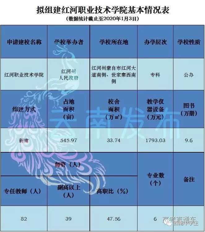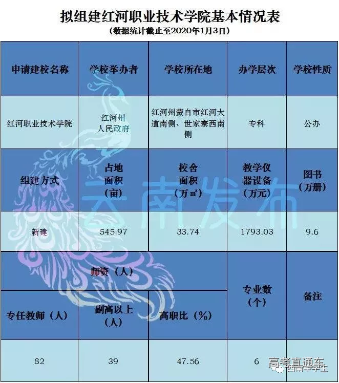 2019年1月3日,云南省教育厅发布《关于设置红河职业技术学院的公示》,根据相关文件要求,省教育厅拟对组建红河职业技术学院组织省高校设置评议委员会专家组进行考察,并按有关程序进行行政许可。拟新建的红河职业技术学院由红河州人民政府举办,是一所专科院校,位于红河州蒙自市,有6个专业。