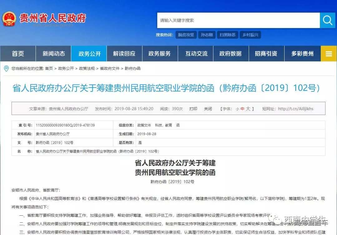 贵州民用航空职业学院的函